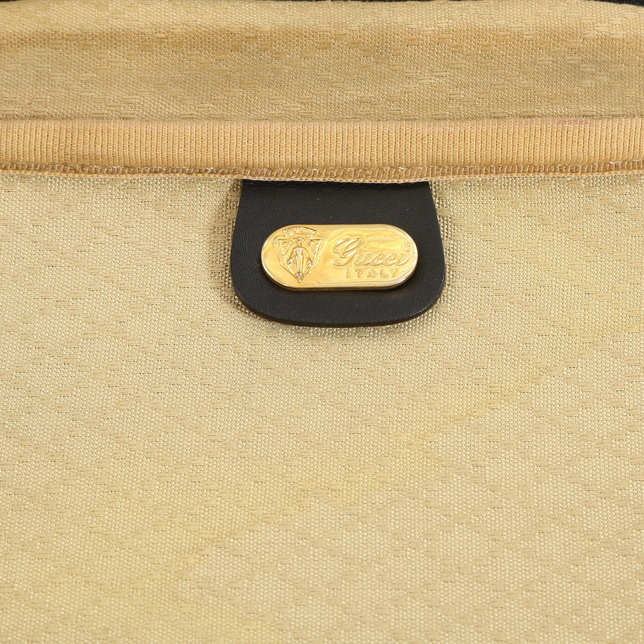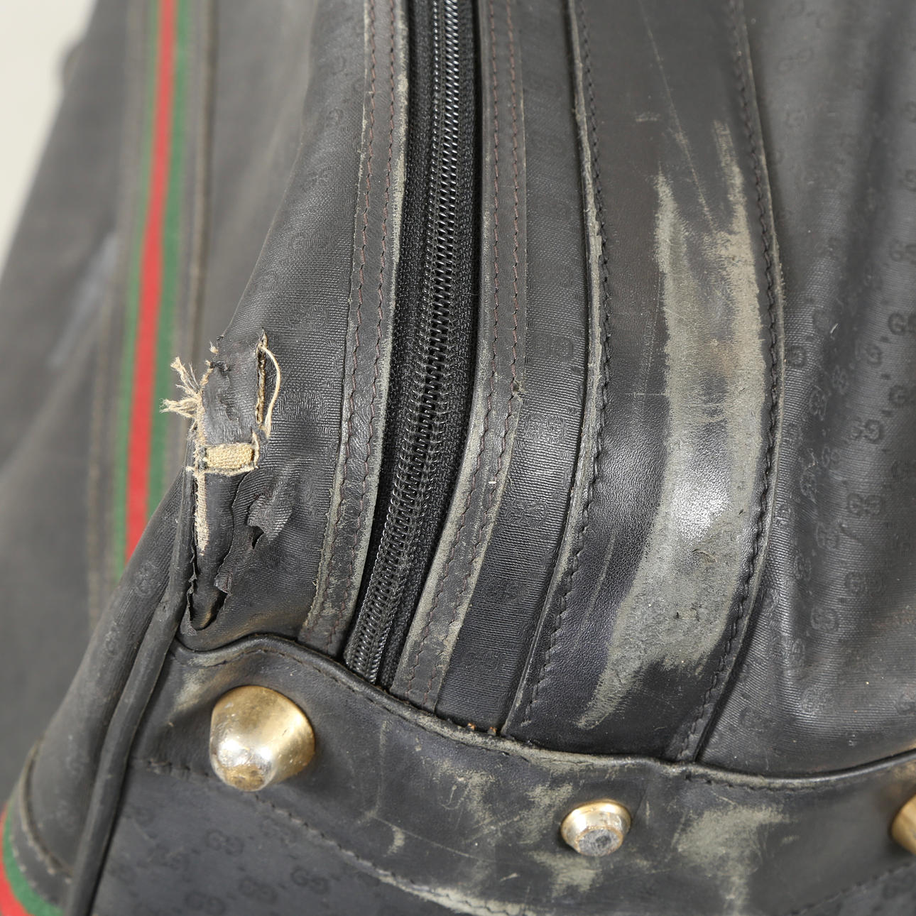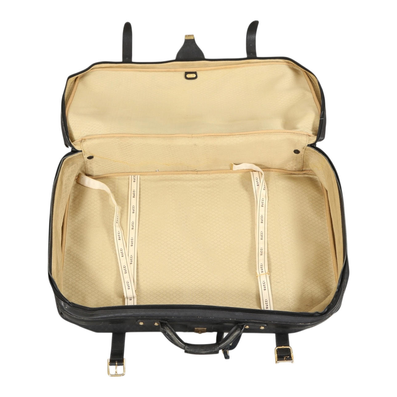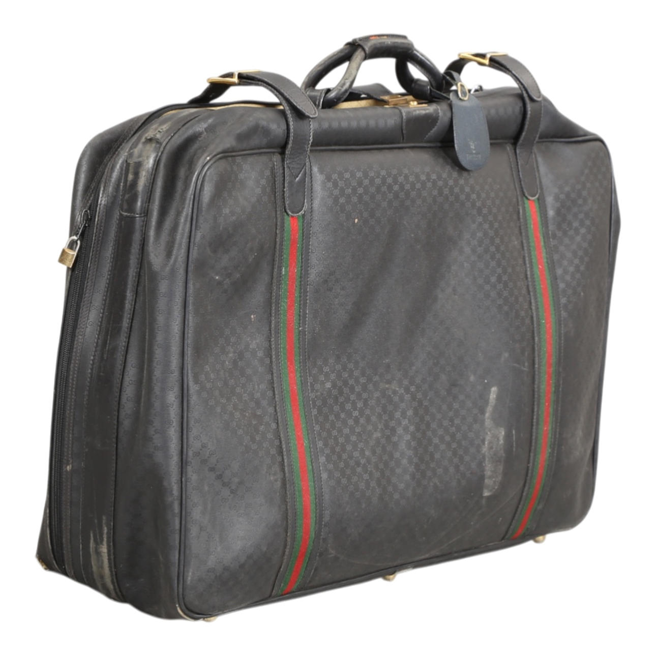 Vintage suitcase with mongram canvas and colored ribbons, inside with a large compartment. Made at Gucci with metal plaque from here on the inside, 1990s. H. 53, B. 85, D. 15 cm.