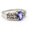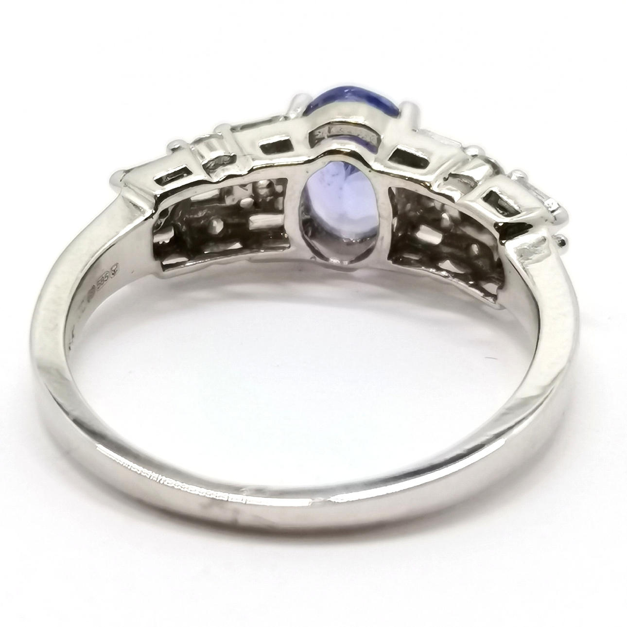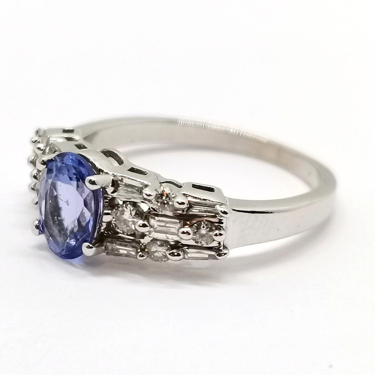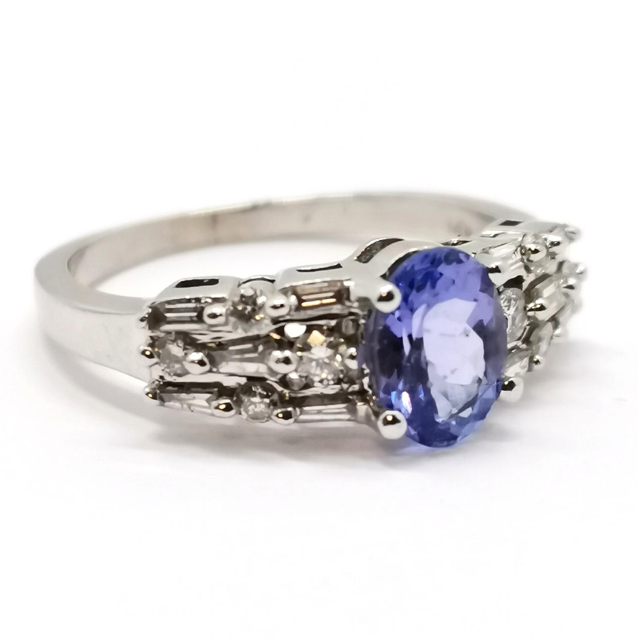 14ct hallmarked white gold tanzanite ring with multi-diamond (18) set shoulders (brilliant / baguette / tapered) - size L & 3g total weight.