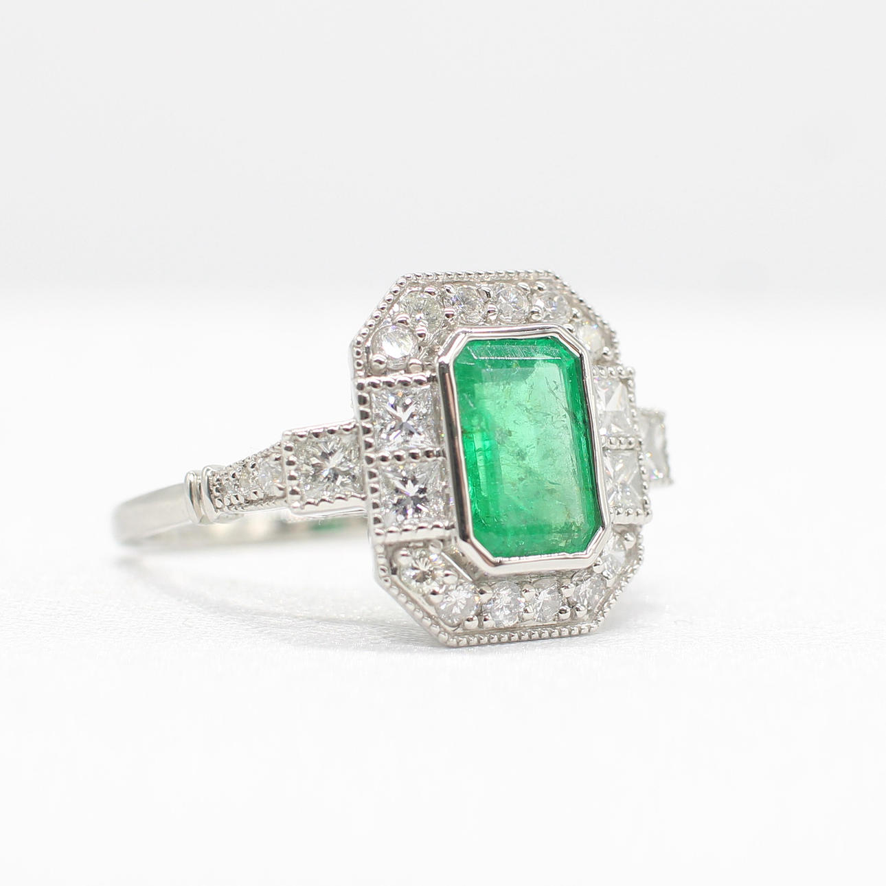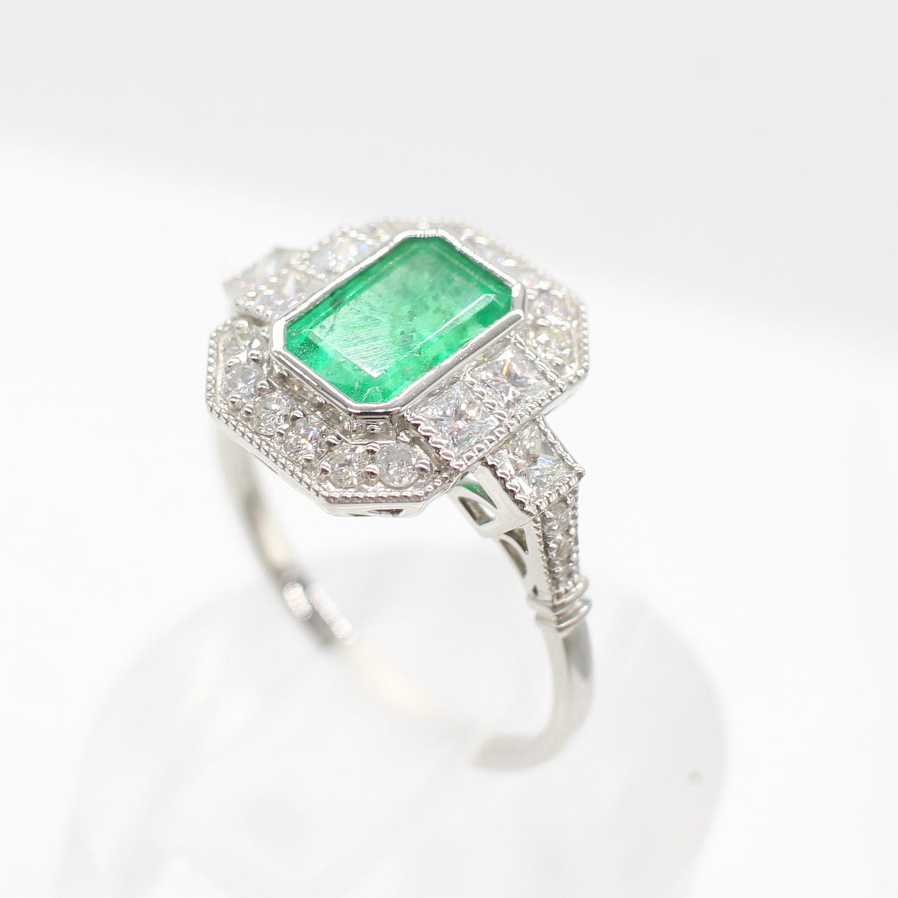A platinum (stamped PT950) step cut emerald and round brilliant and princess cut diamond ring set in an art deco style.