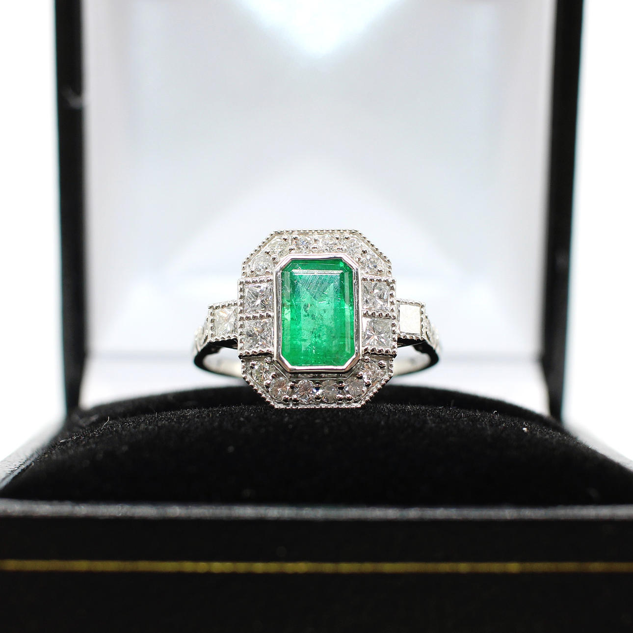 The central emerald, natural, is 1.06ct (stamped inside the ring)