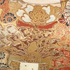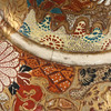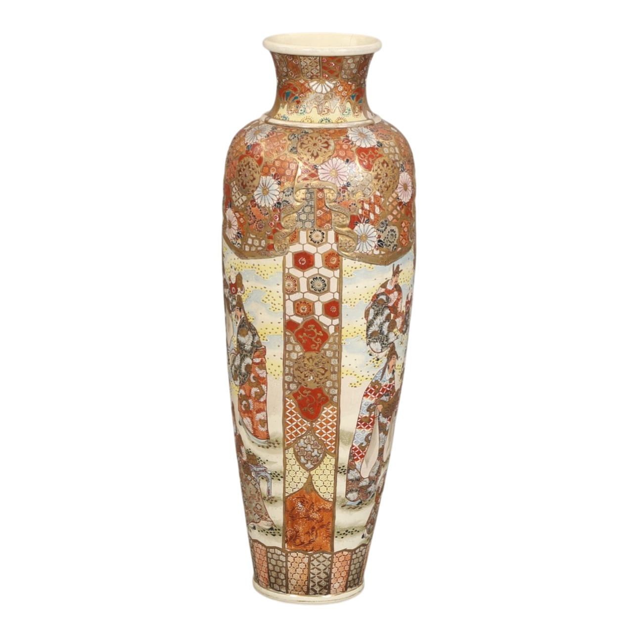 Colossal Satsuma vase of earthenware, the top lightly modelled with draped cloth, decorated in polychrome glaze and gold with figurative scenery featuring deity, sages and children as well as friezes with geometric patterns, cranes and flowers. Unstamped. The beginning of the 20th century. H. 94, Ø 31 cm.