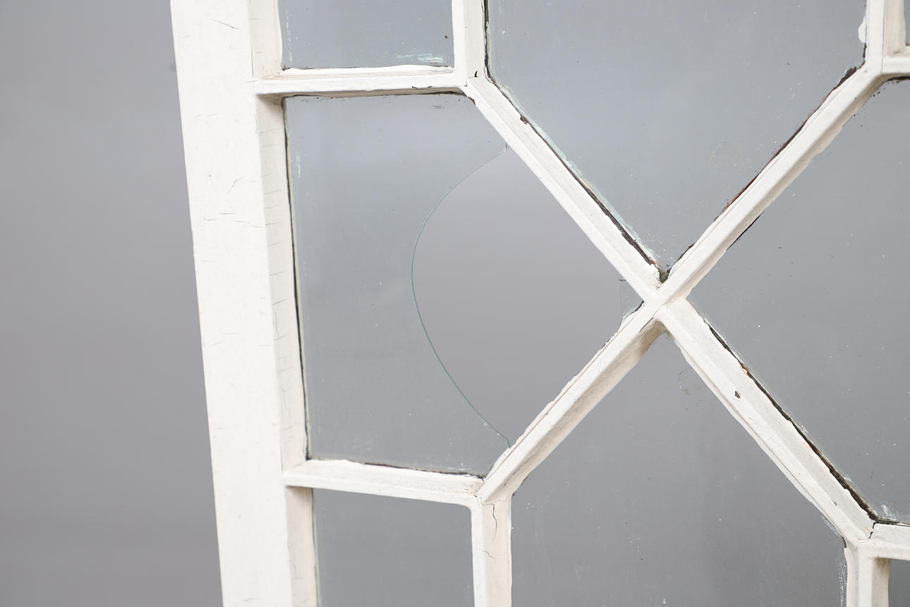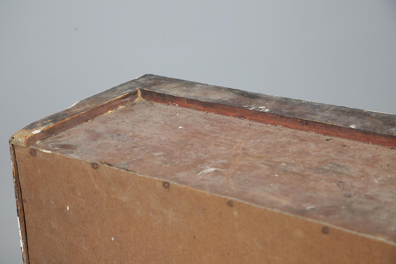 Some shrinkage splits and losses. Wear and marks to painted surface. Missing lock plate. Signs of old worm. A few sections of glazing broken. Other imperfections. See online images.
