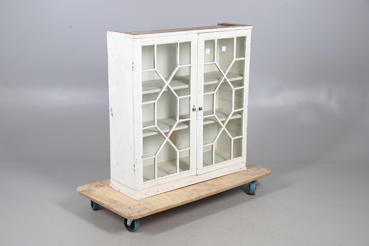 with astragal glazed doors opening to reveal fitted shelves, 92cm x 30cm x 98cm high.