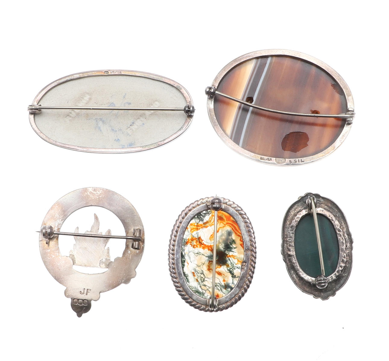 5015536. FIVE SILVER MOUNTED BROOCHES.