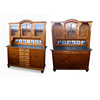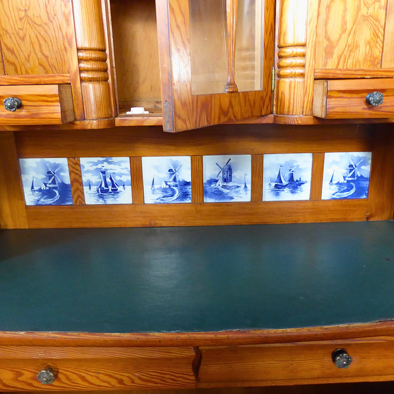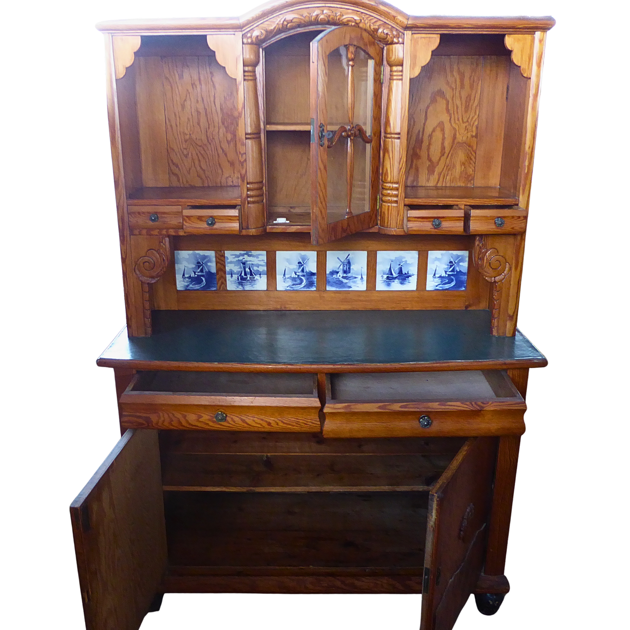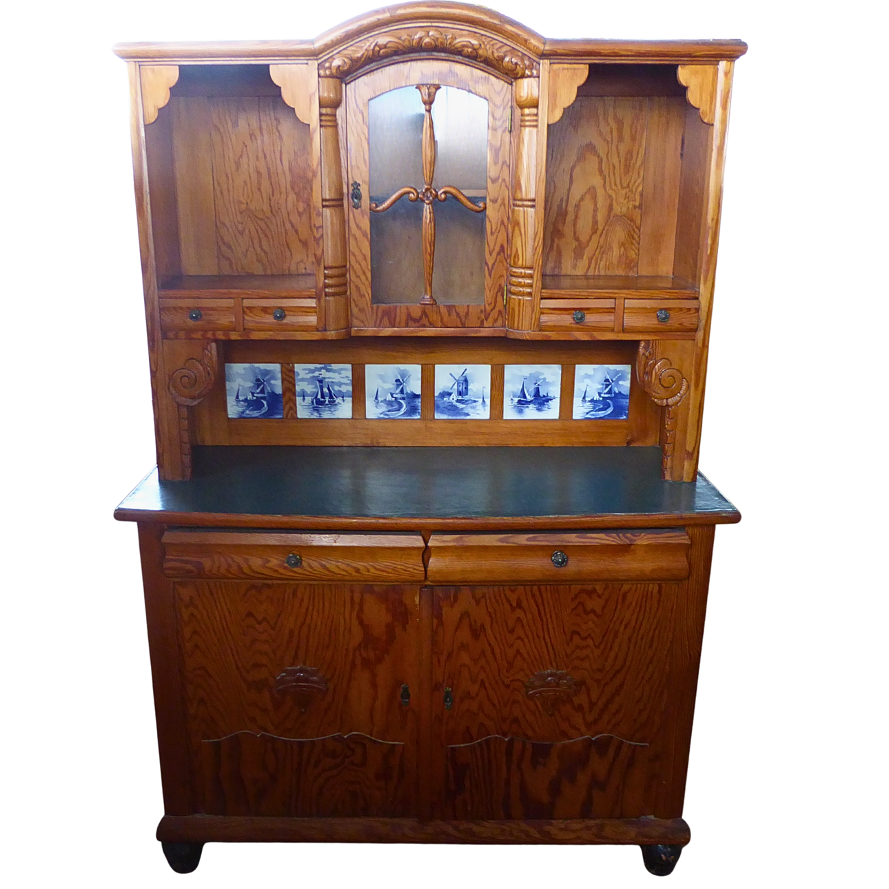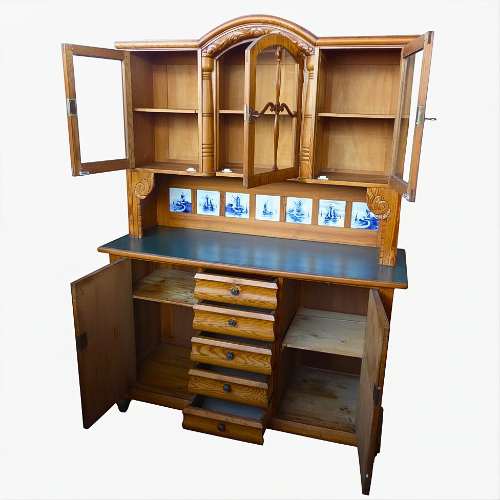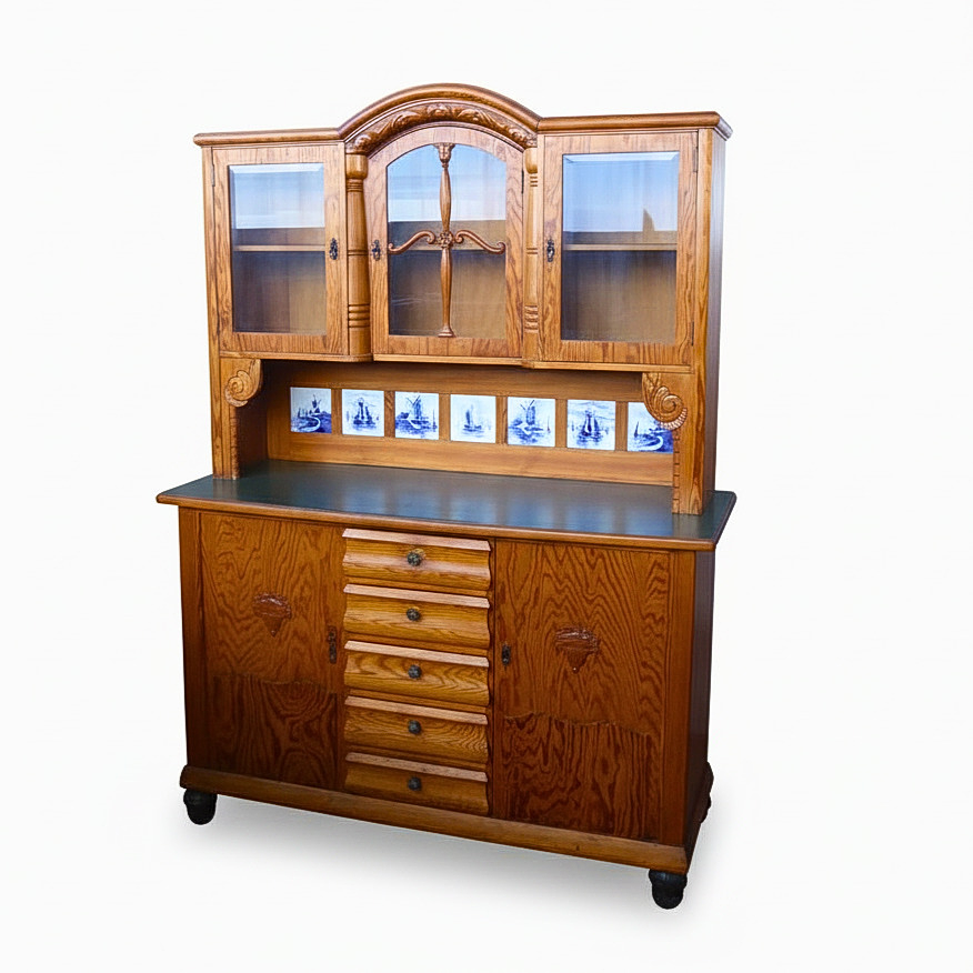 Two-piece kitchen buffet, made of oak wood. Both base cabinets have an attachment, which features the central arched door with decorative wooden rung and the side display cabinet compartments. A special feature is the integrated tile mirror consisting of six and seven blue-white ceramic tiles with Dutch windmill and ship motifs in Delft style. Both base cabinets offer enormous storage space thanks to the two large doors, as you can see from the pictures.