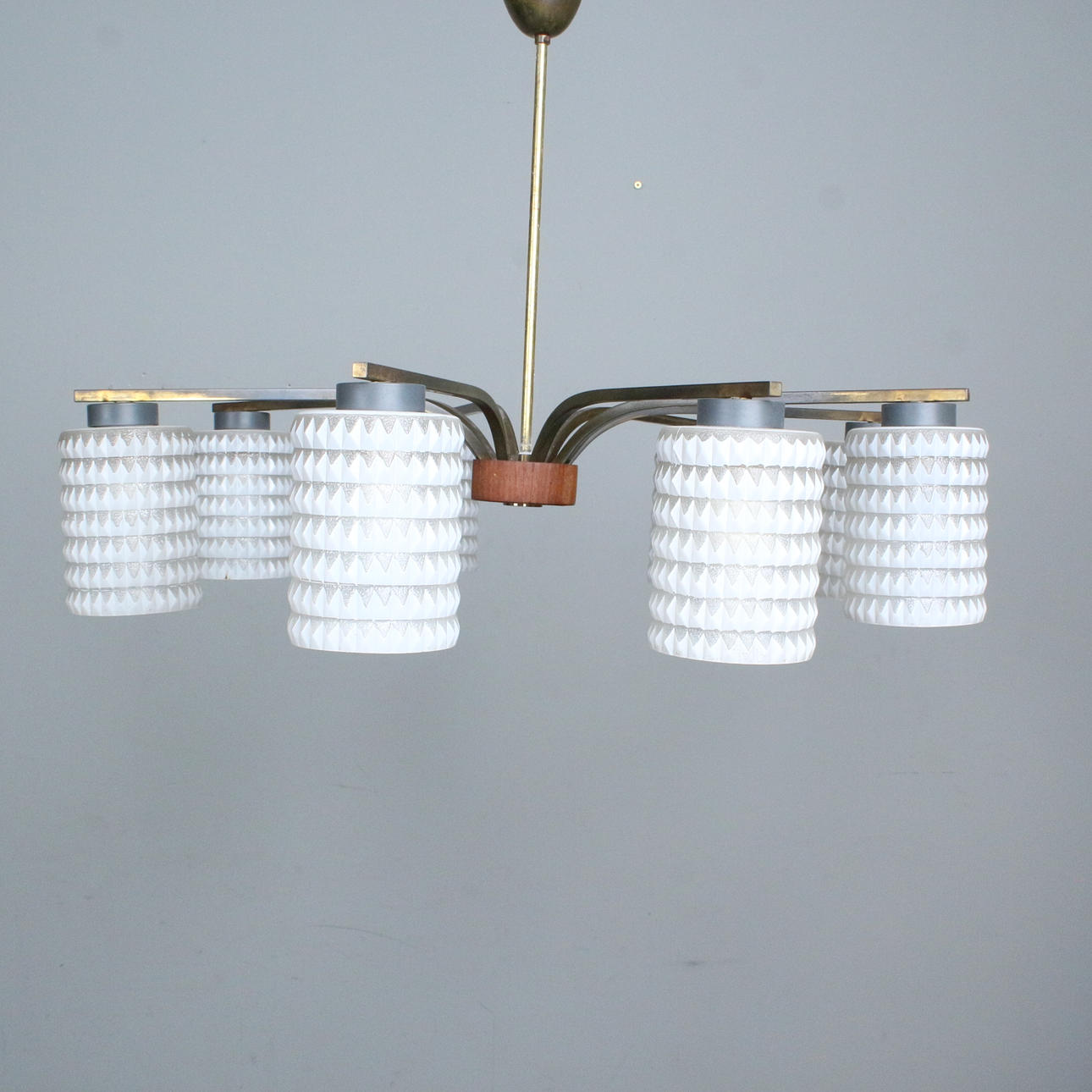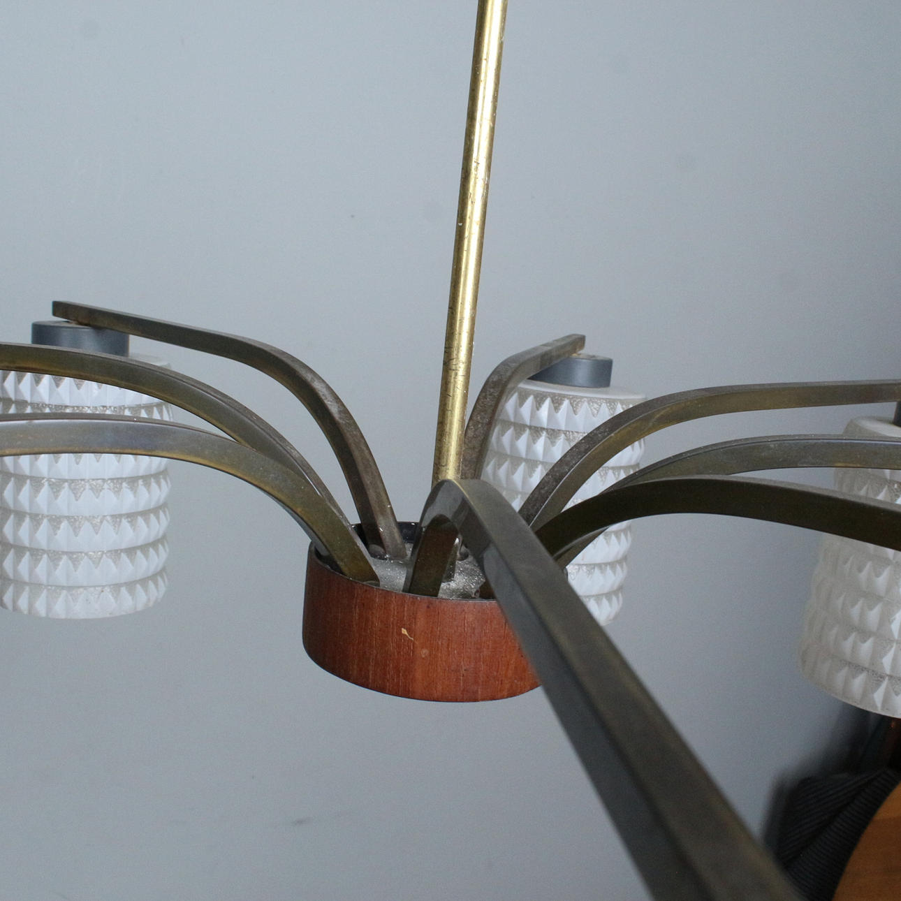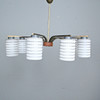 8-armed “Spider” ceiling lamp from the 1960s. Made of metal, glass and teak.