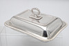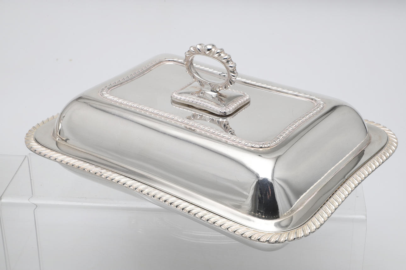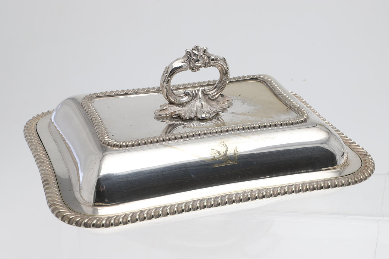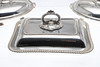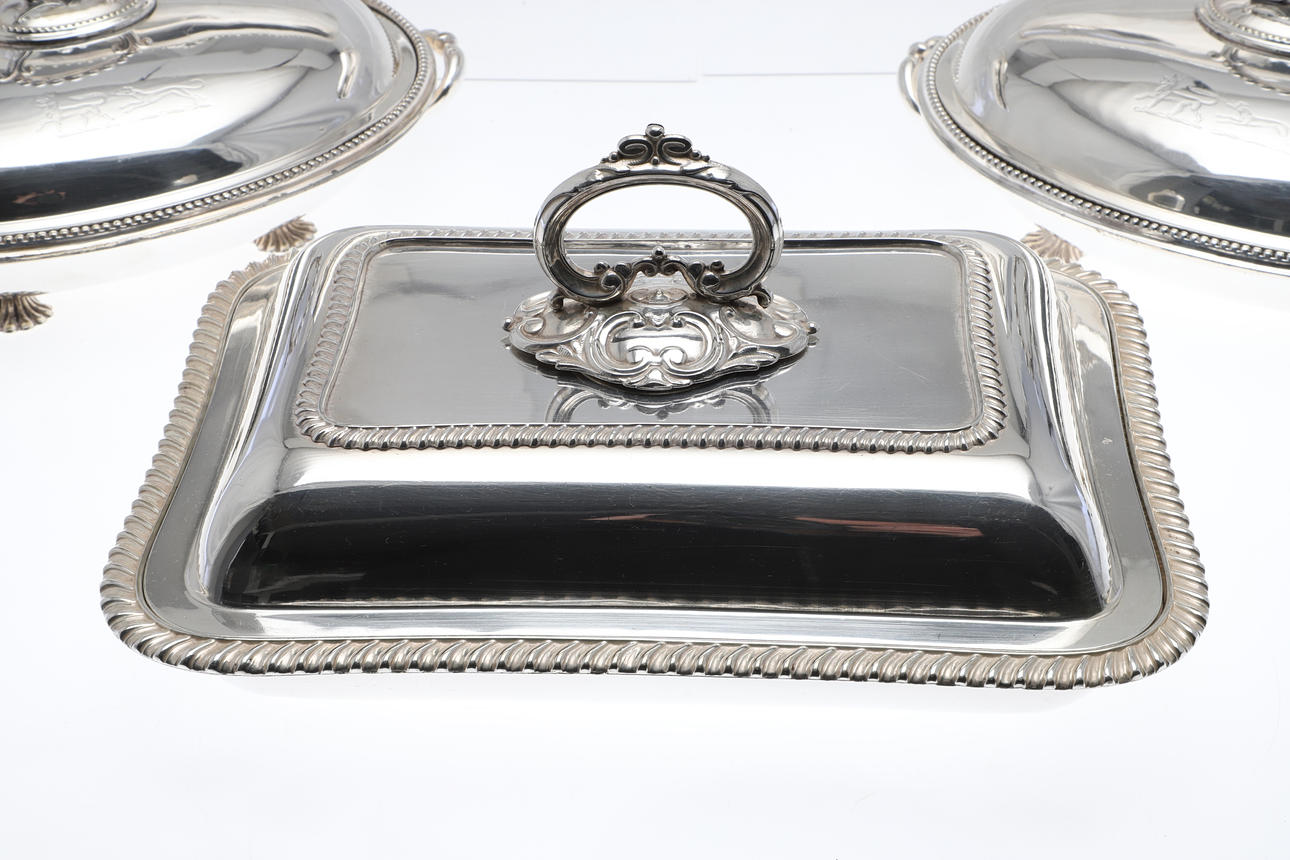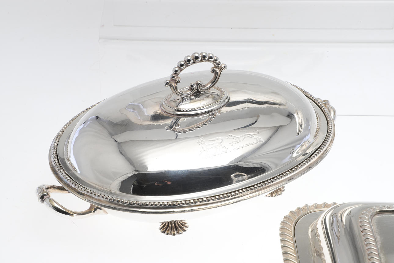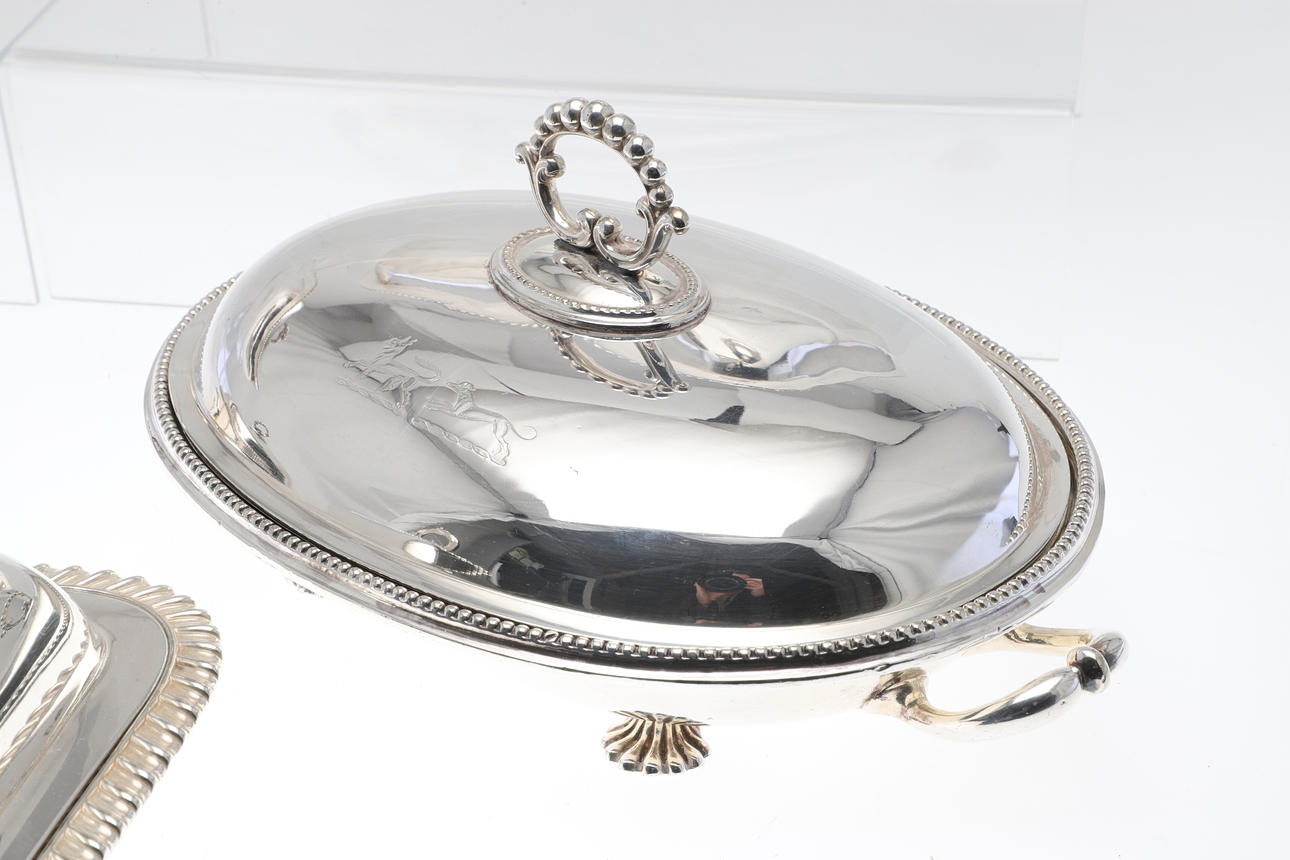 A set of five silver plated lidded serving dishes, including a pair of oval dishes with dog engravings and raised on fluted feet, together with three rectangular dishes with gadroon edges, each with a different handle and one with an etching. Size of largest, 12cm (h) x 29cm x 21.5cm. (5).