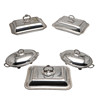 A SET OF FIVE SILVER PLATED LIDDED SERVING DISHES.