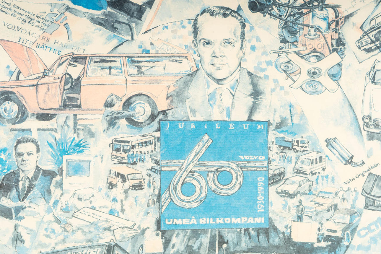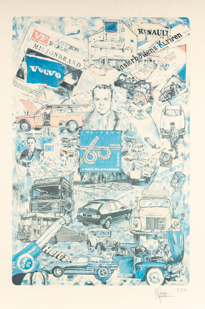 Colour lithograph at the car company in Umeås celebrating 60 years. dated 1990