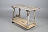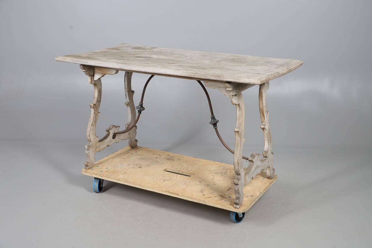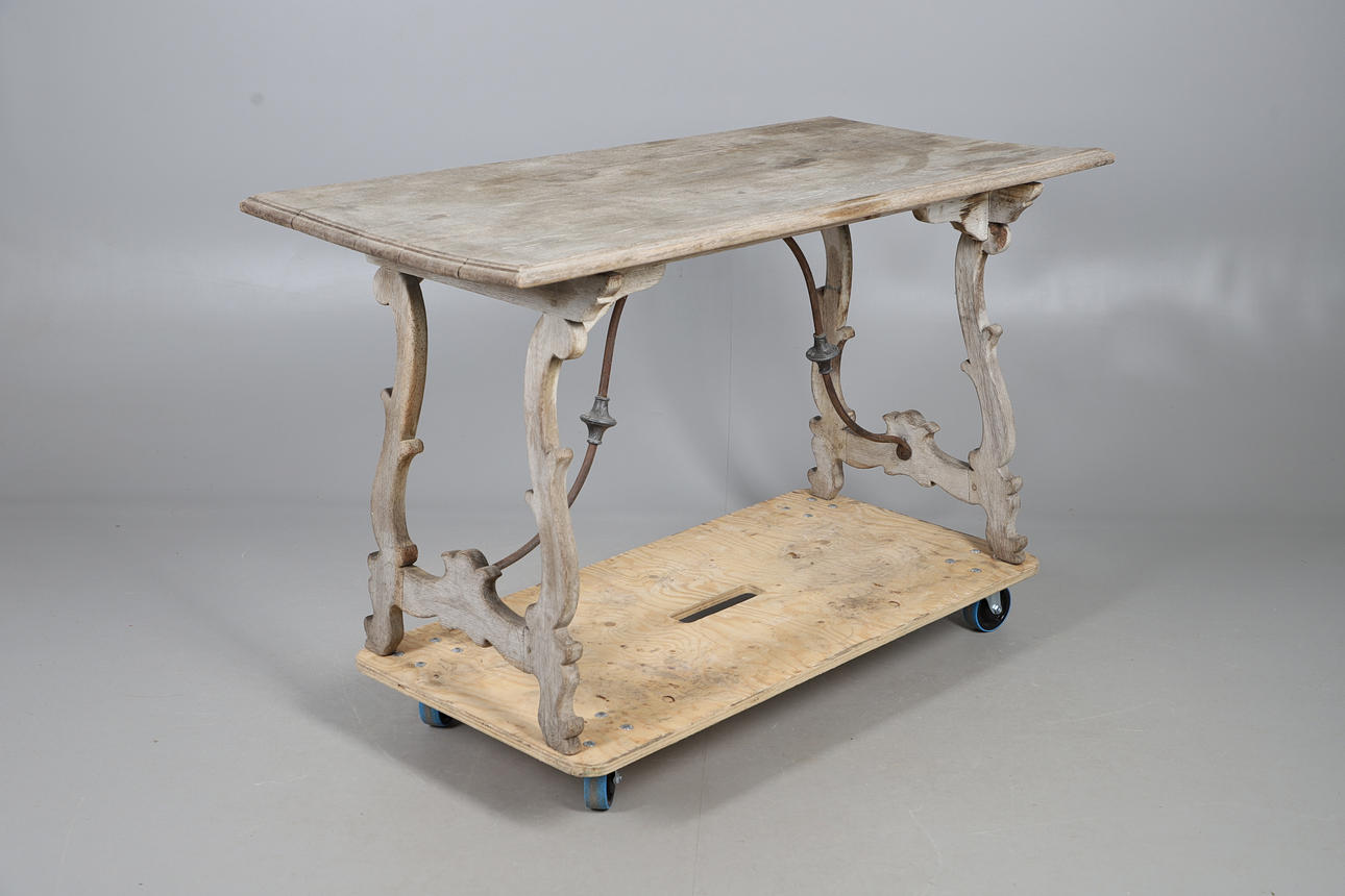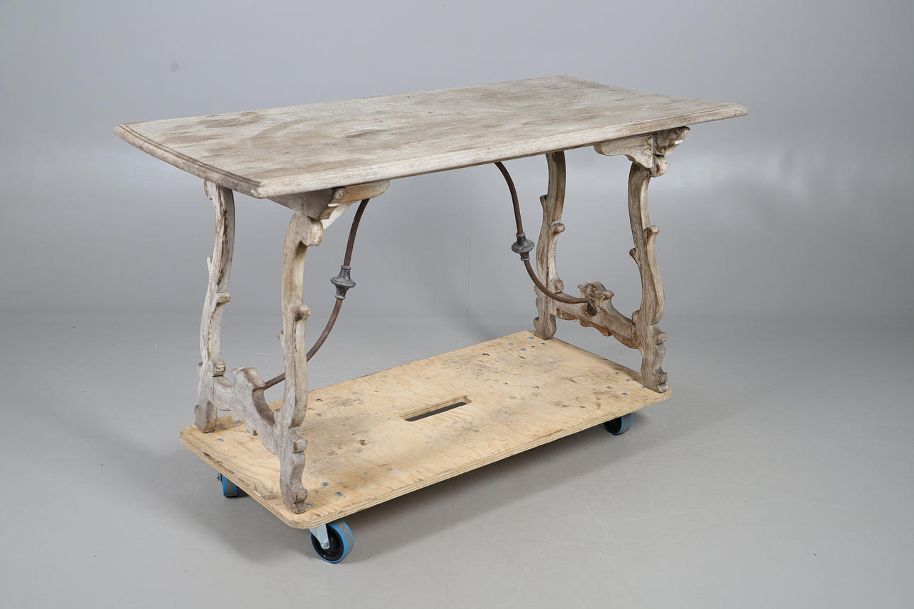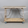 the rectangular top upon foliate carved ends, united by curved ironwork, 78cm high x 136cm wide x 67cm deep.