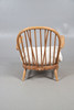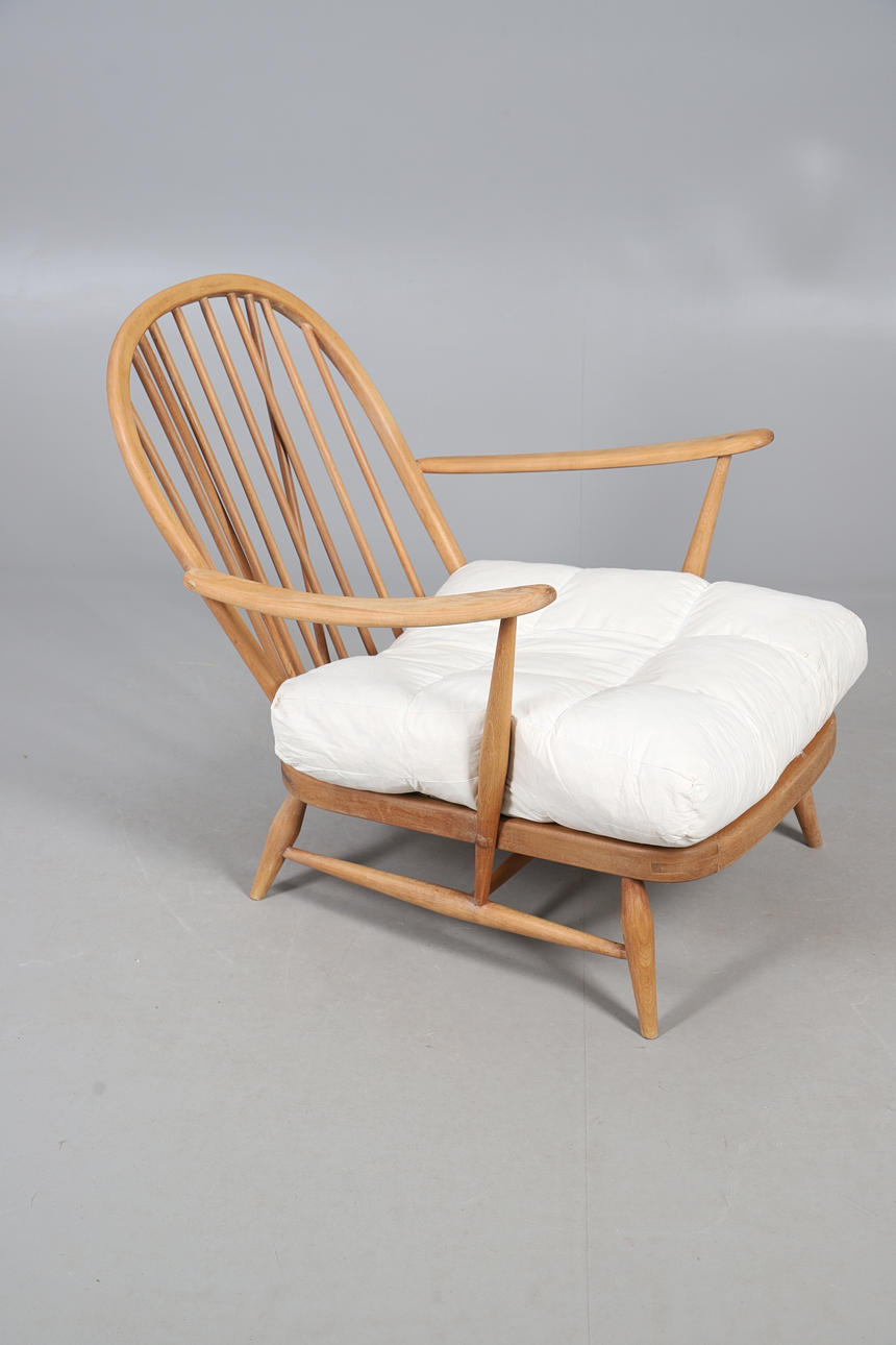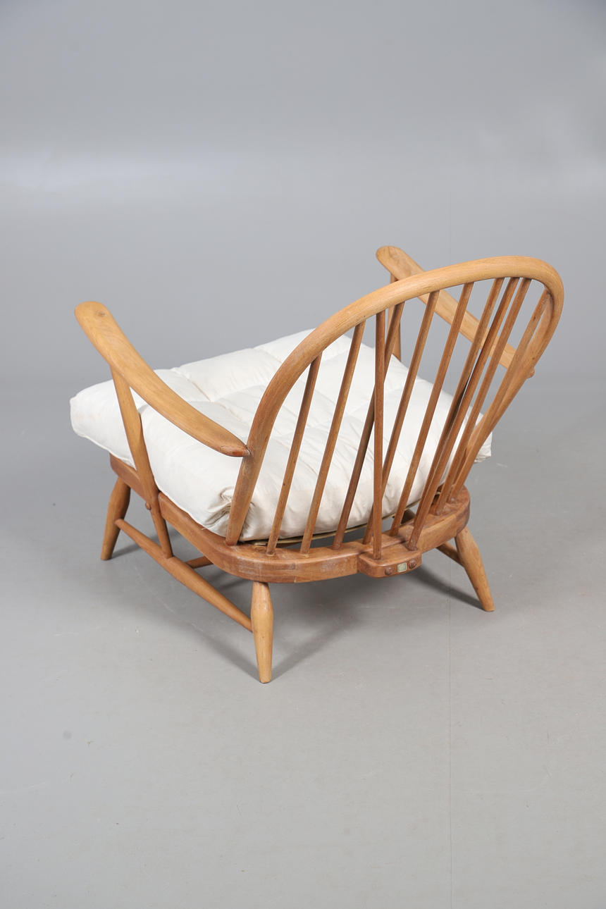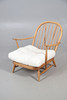 An Ercol spindle back lounge chair, with markers label to the back, a cushioned seat, and raised on tapered supports. 76cm (h) x 70cm (w) x 24cm (seat height, not including cushion).