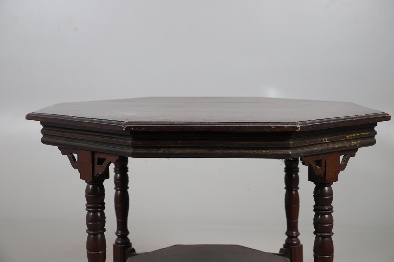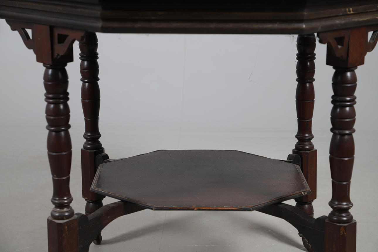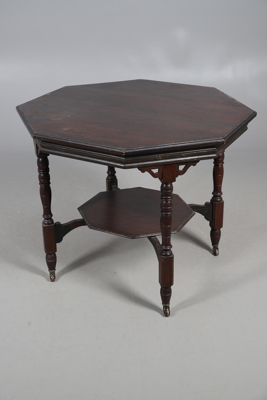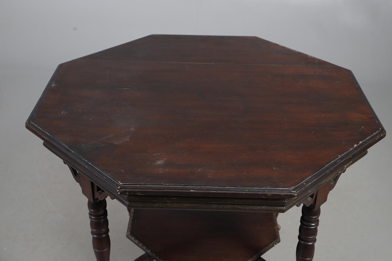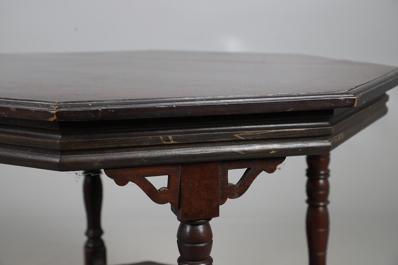 OCTAGONAL MAHOGANY BREAKFAST TABLE WITH FOUR CANE SEATED CHAIRS.