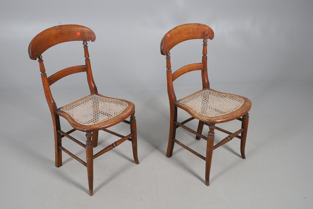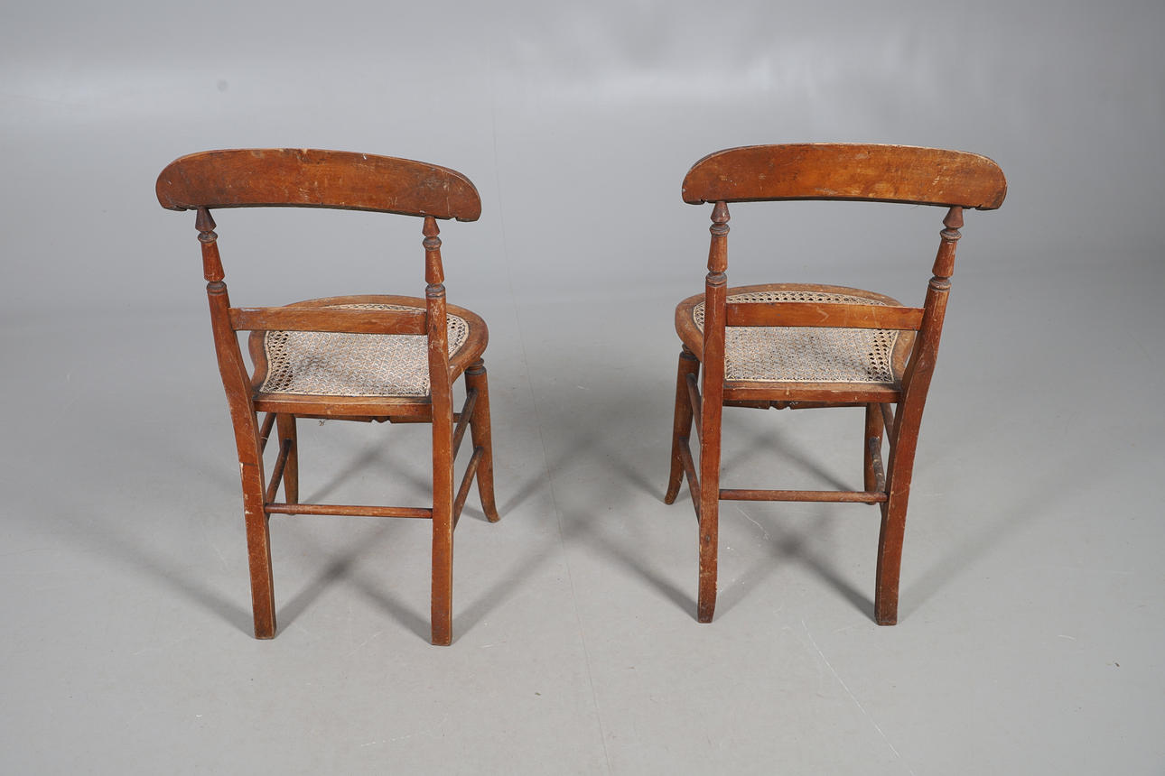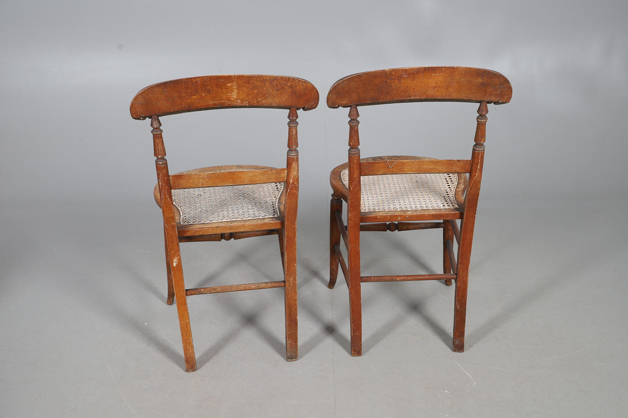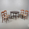 Wear commensurate with age and use. Scuffs, scratches and a hairline split to table, chairs worn and parts faded with occasional holes to canework. See online images.
