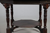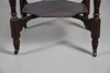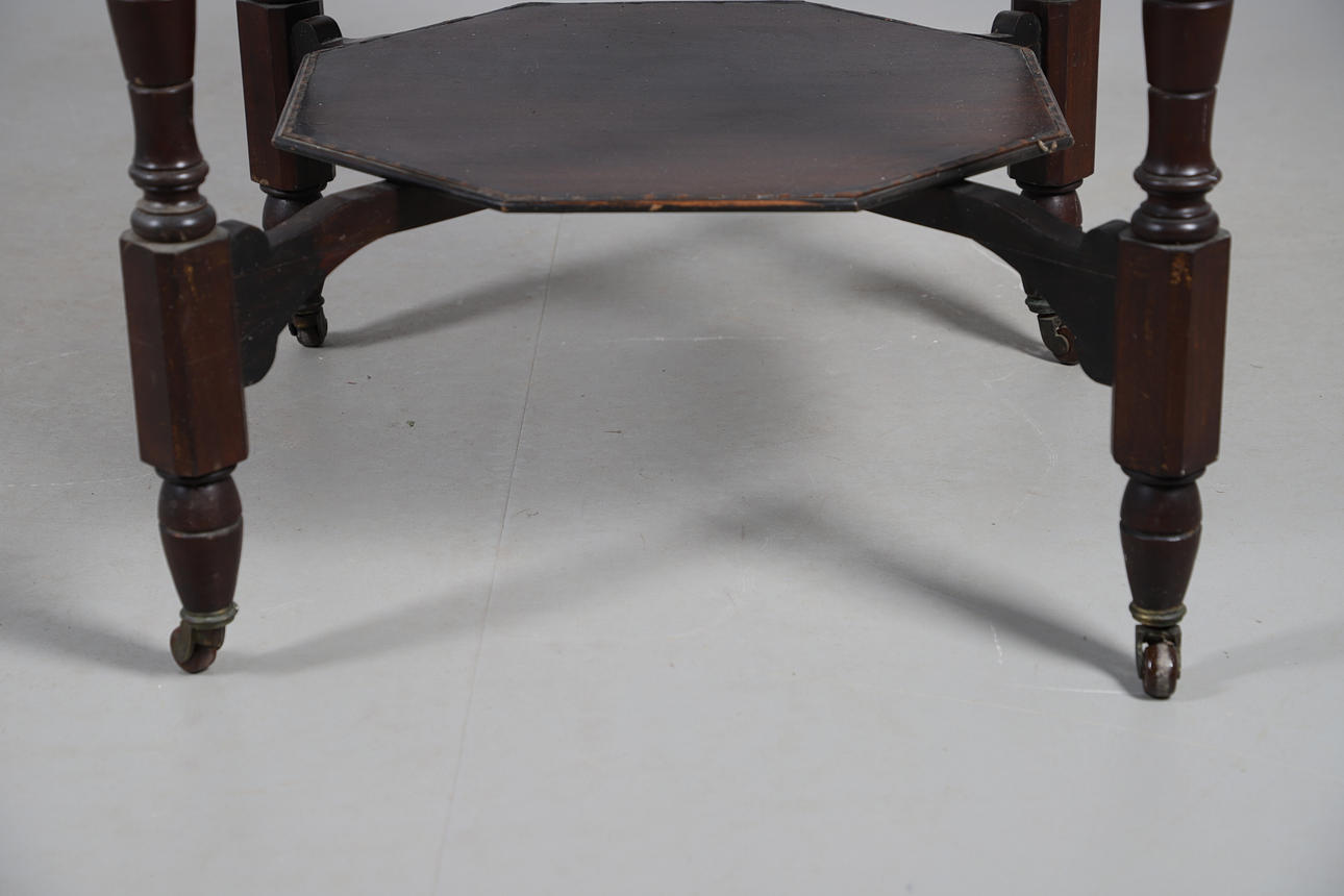 Table with stretcher tray, raised on turned supports on casters, W88 x H73cm. Also with four cane seats W40 x H86 x D38, seat H44cm (5).