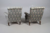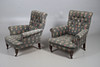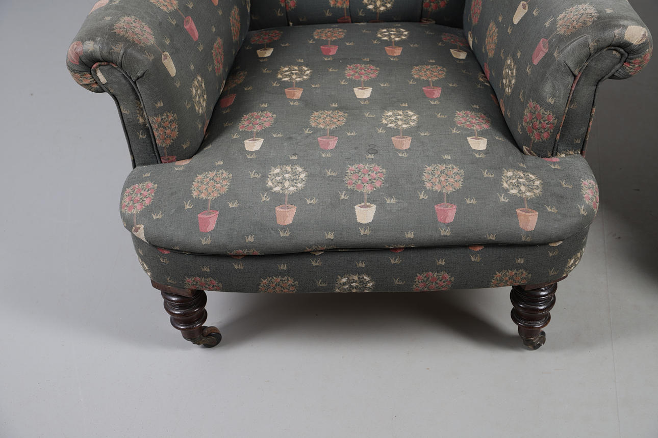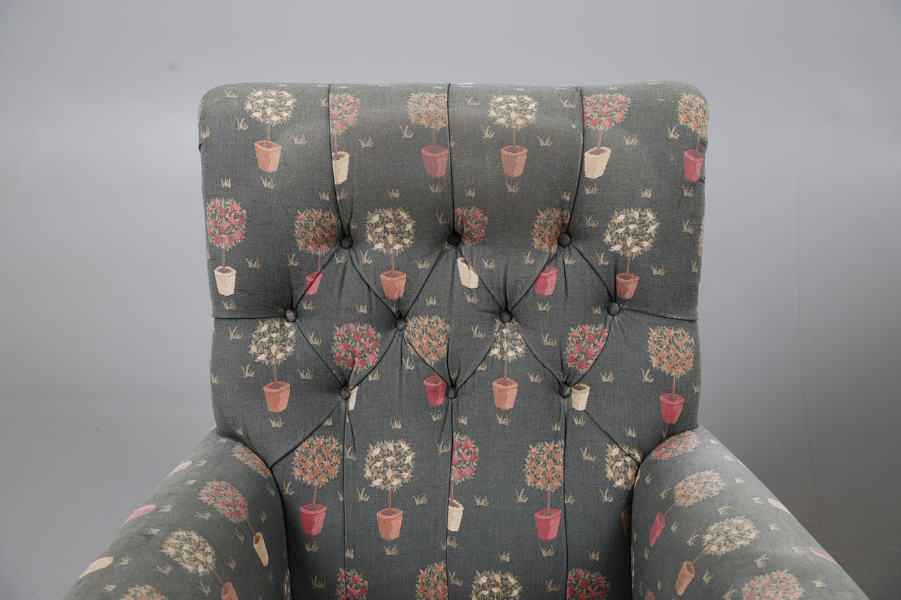 A pair of button back armchairs with garden inspired upholstery, supported on short turned legs and castors. 91cms high.