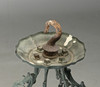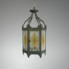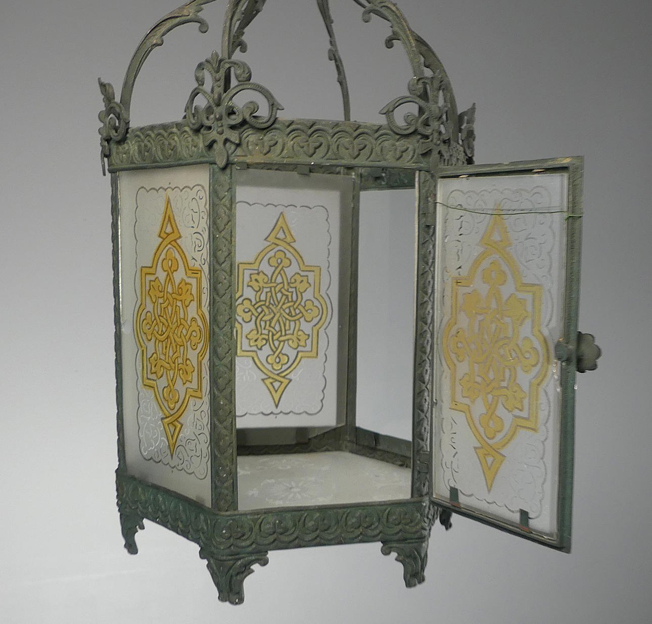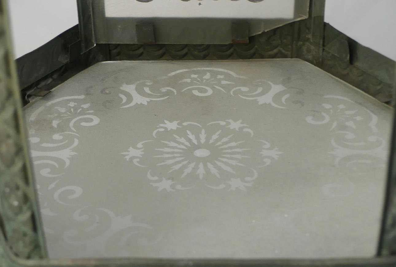 Two glasses are in clear glass, small rejects and a larger one. Door glass lacks upper attachment points, hence wire. Missing candle holder.