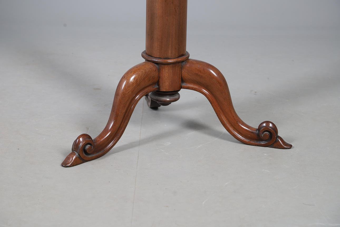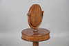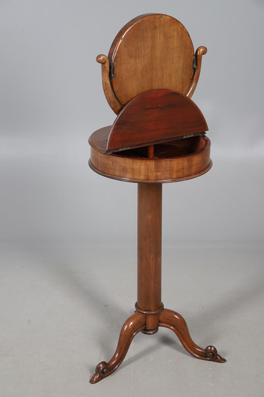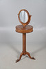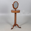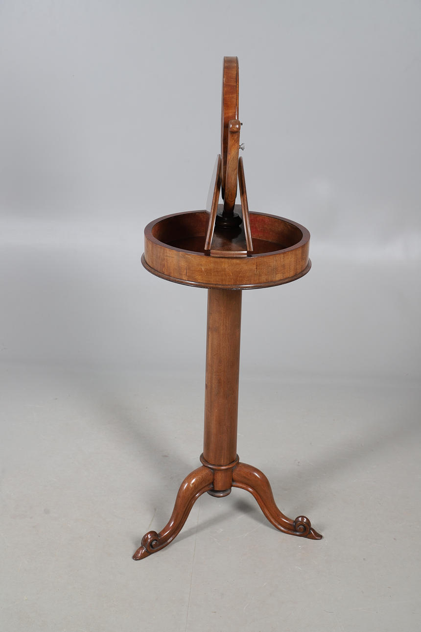 A Victorian mahogany shaving stand, with a circular swing mirror raised on a circular cabinet with two compartments, and tripod support with scroll feet. 136cm (h) x 45cm (w).