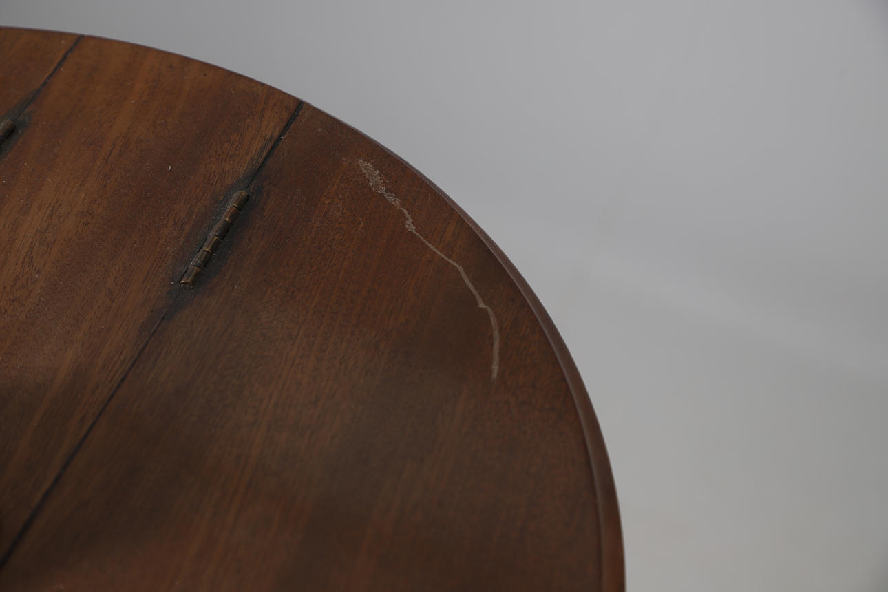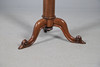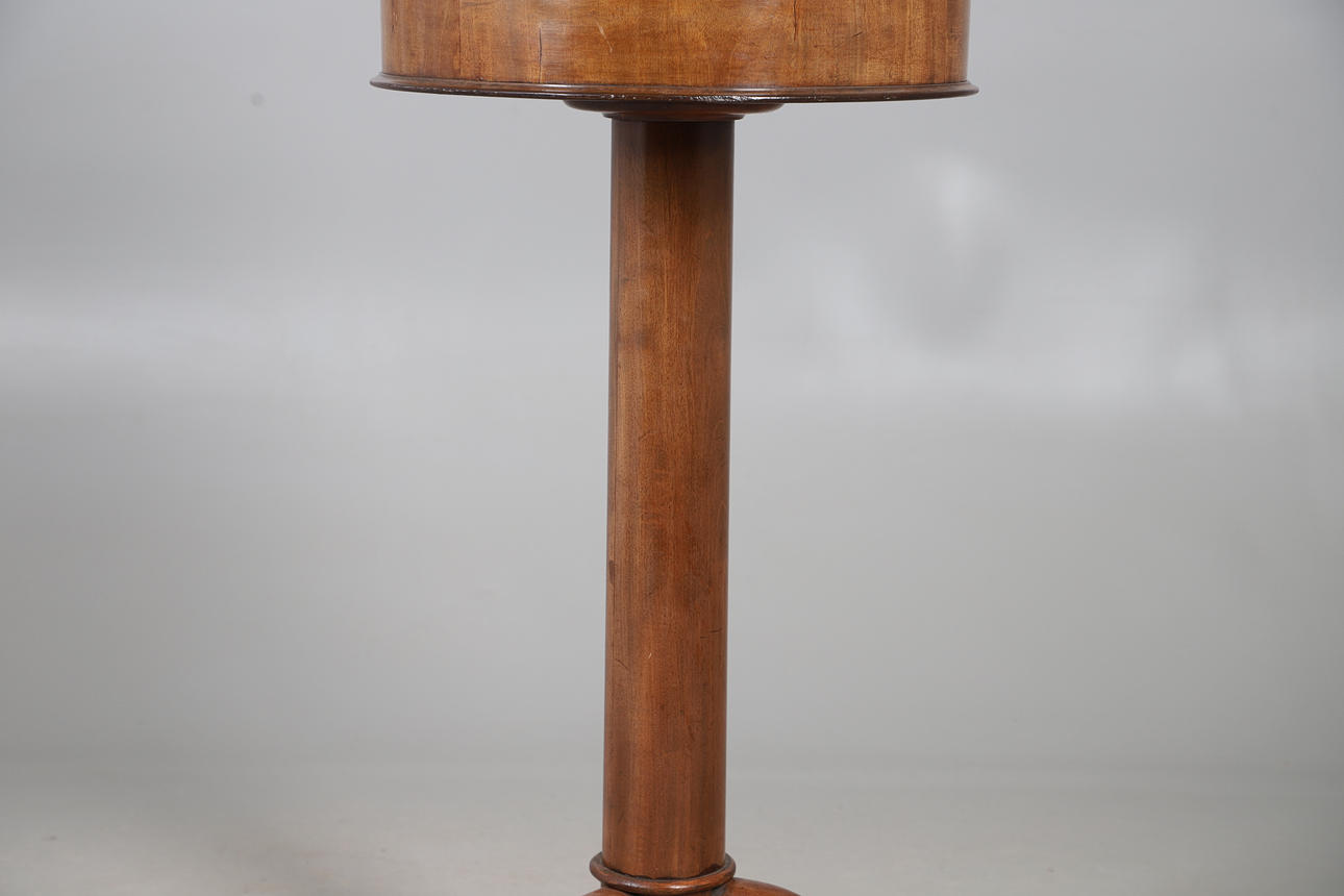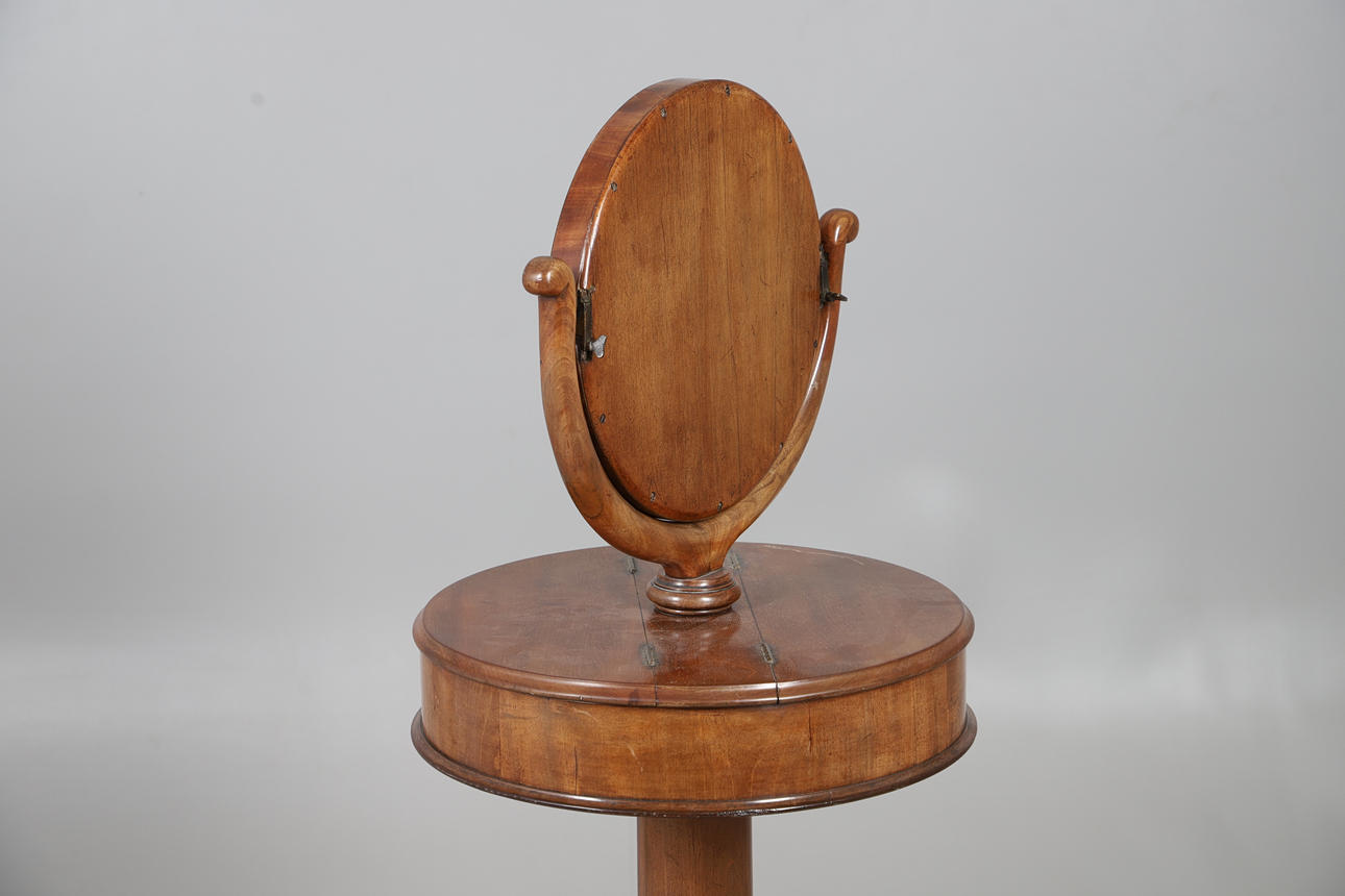 A Victorian mahogany shaving stand, with a circular swing mirror raised on a circular cabinet with two compartments, and tripod support with scroll feet. 136cm (h) x 45cm (w).