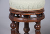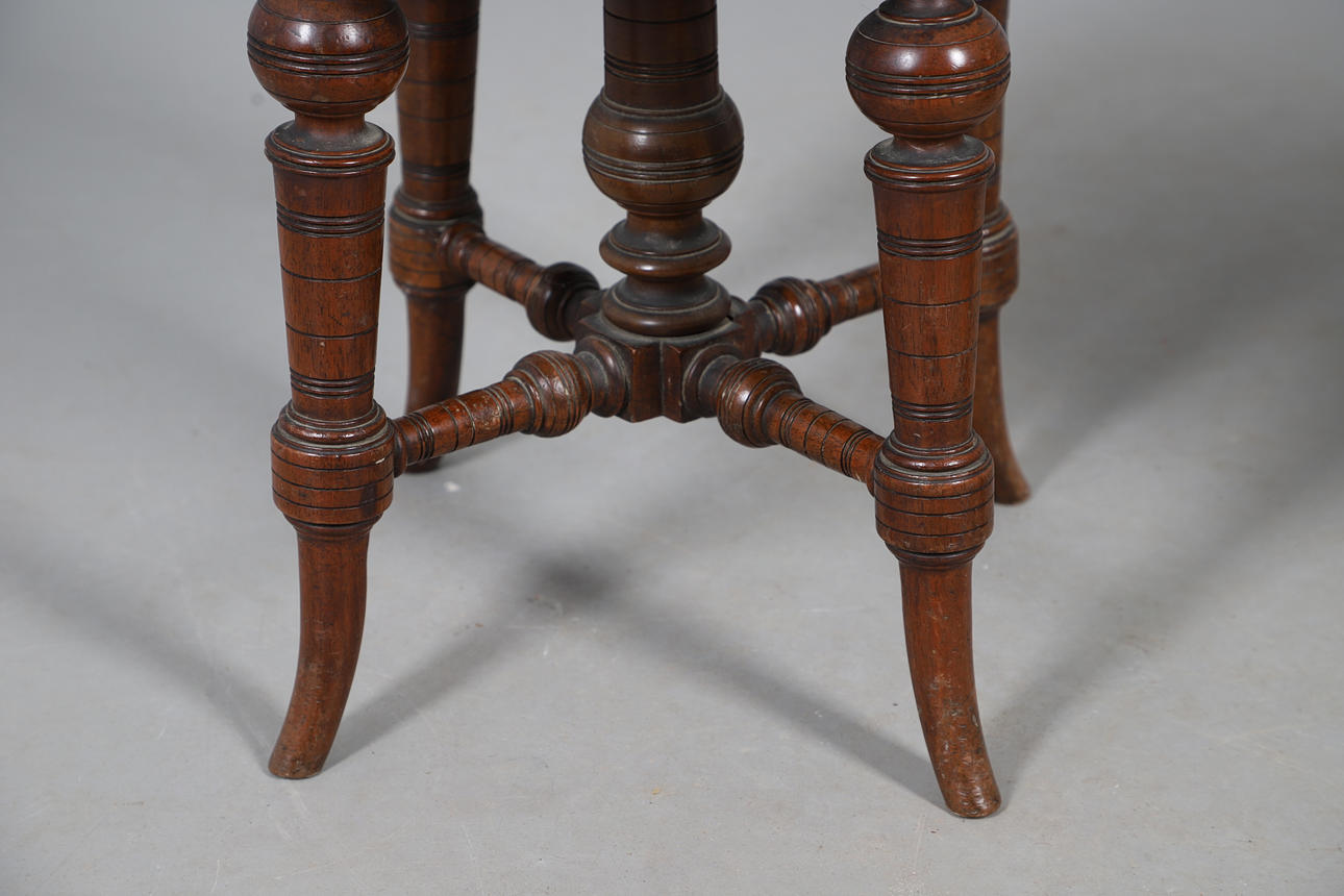 stool with carved decoration, some old signs of worm underneath, a few marks to the seat, piece missing at the top of the base underneath