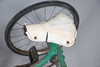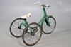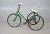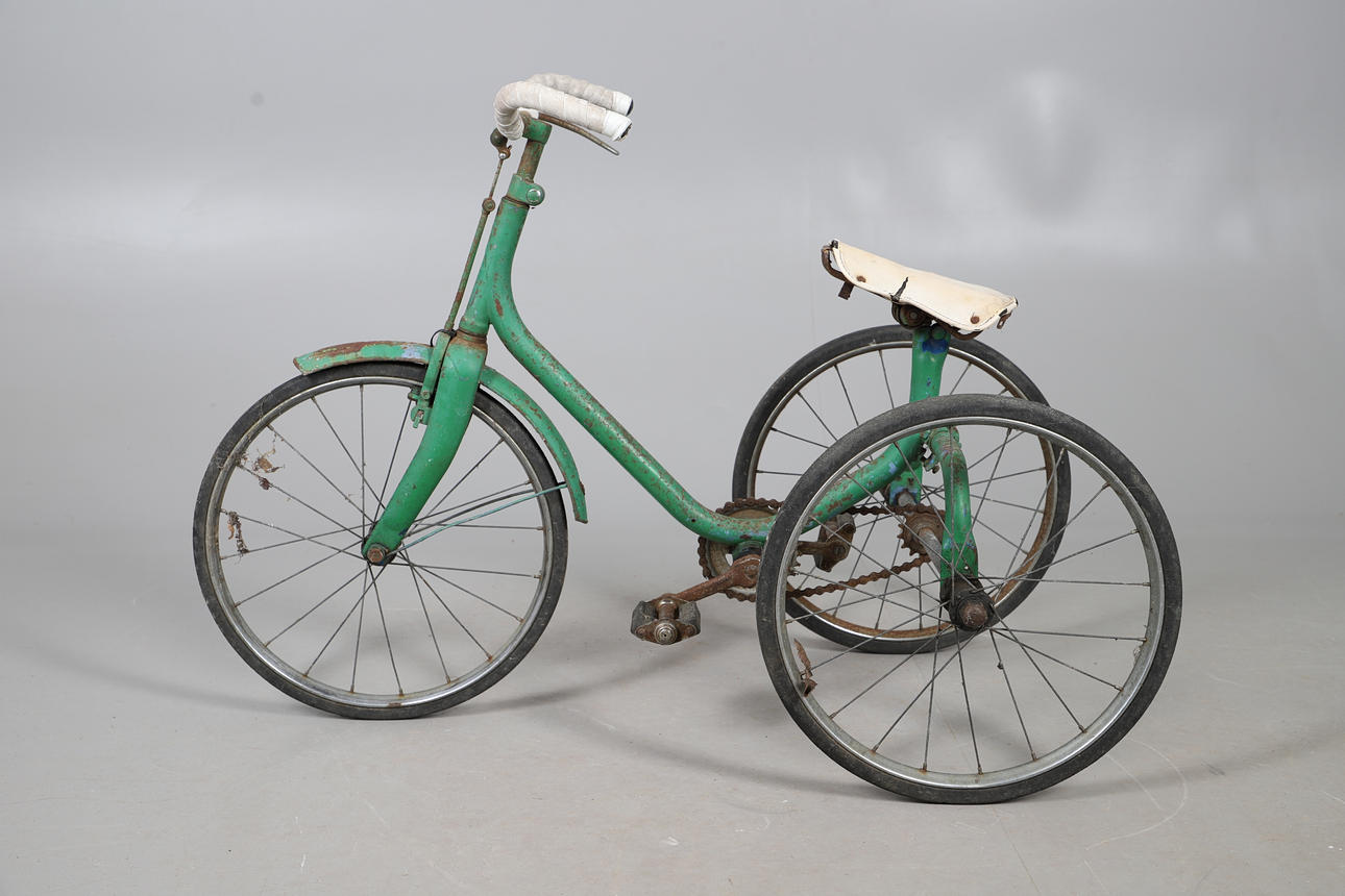 A vintage childs tricycle with original seat and wheels and in a green livery. 72.5cms high.