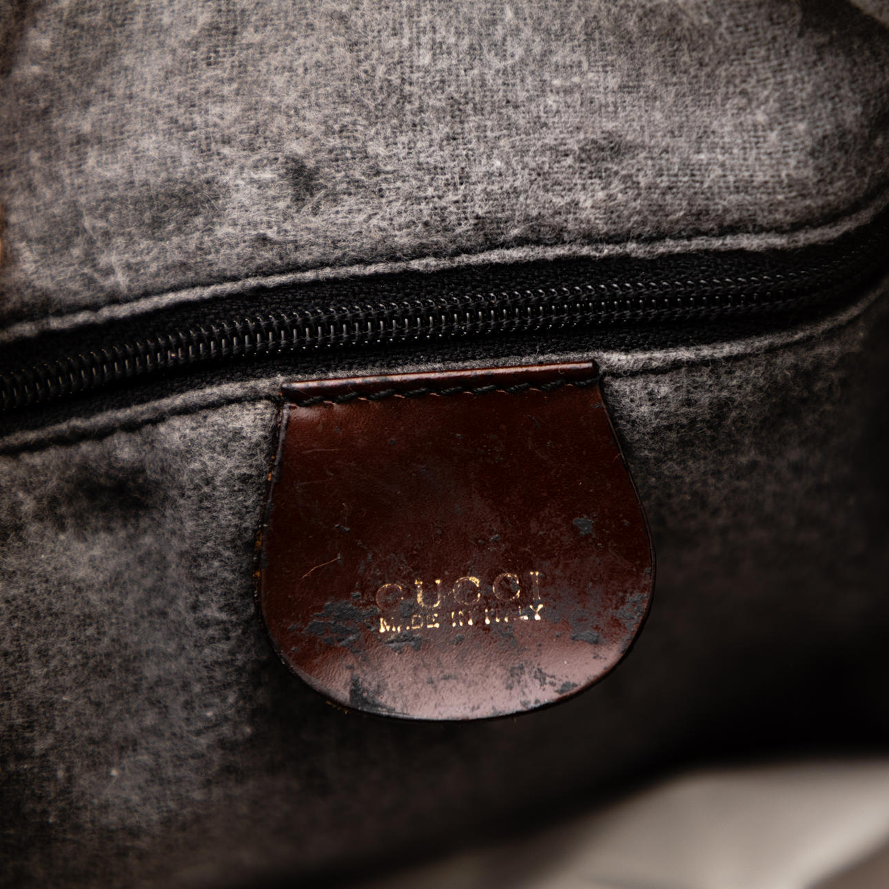 Signs of use with stains. Black faux leather lining inside the bag is abraded.