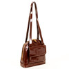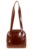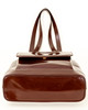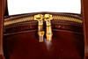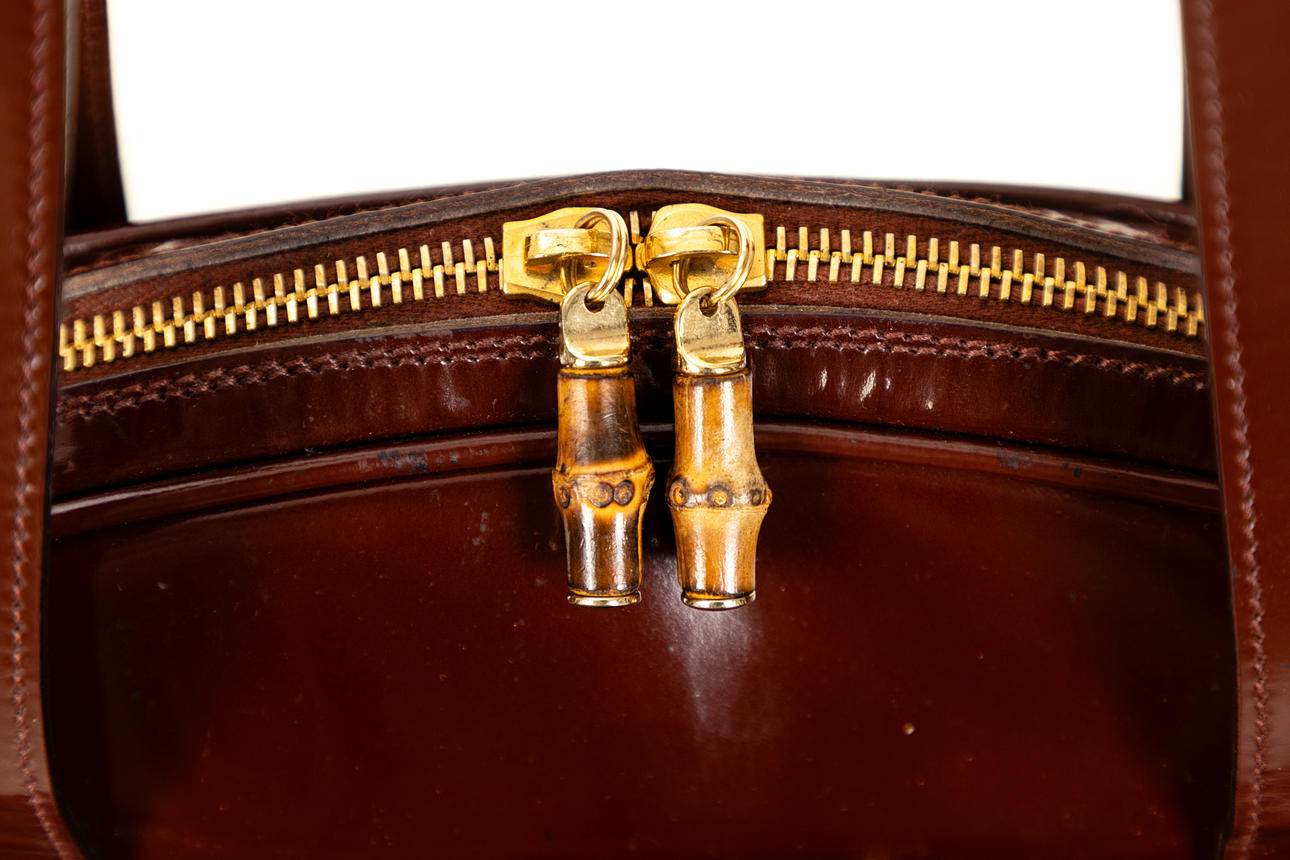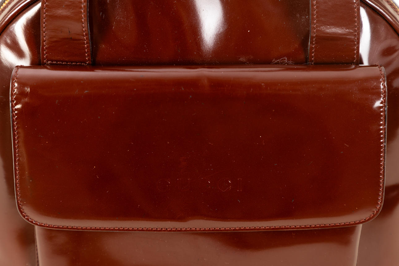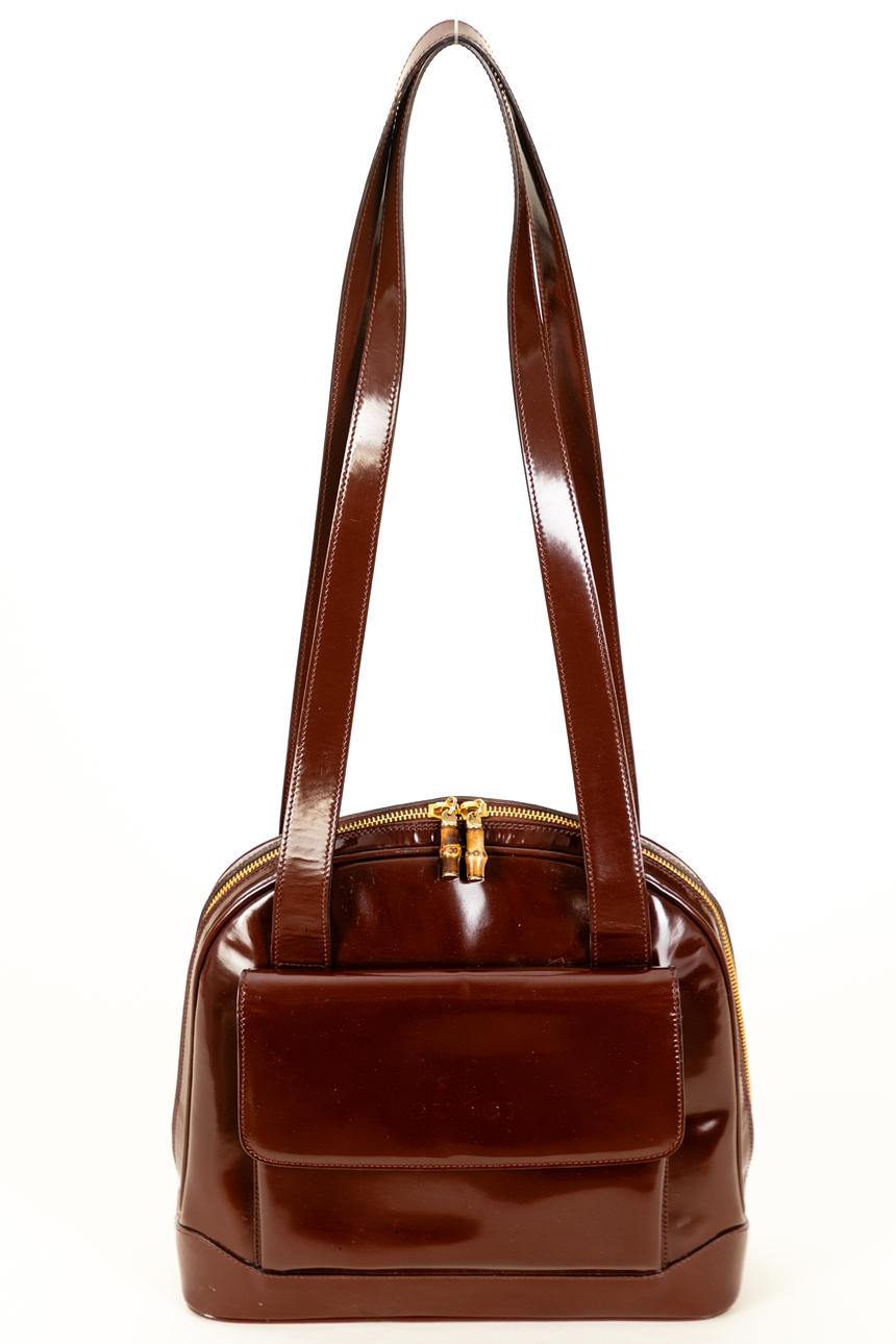 Patent leather in brick red. One patch pocket with snap button, zipper with bamboo-shaped pull. One interior compartment with zipper. Brand name and serial number.
