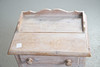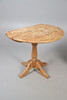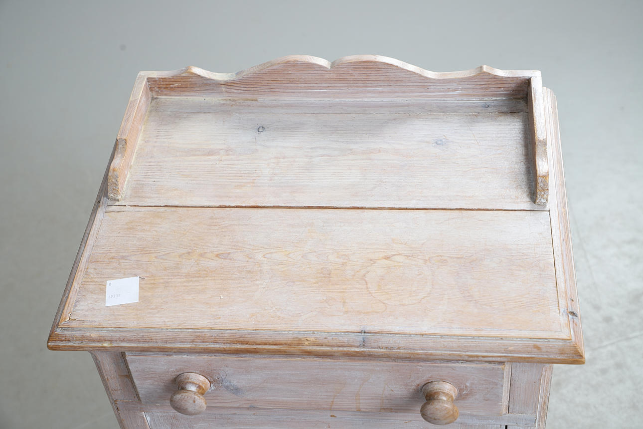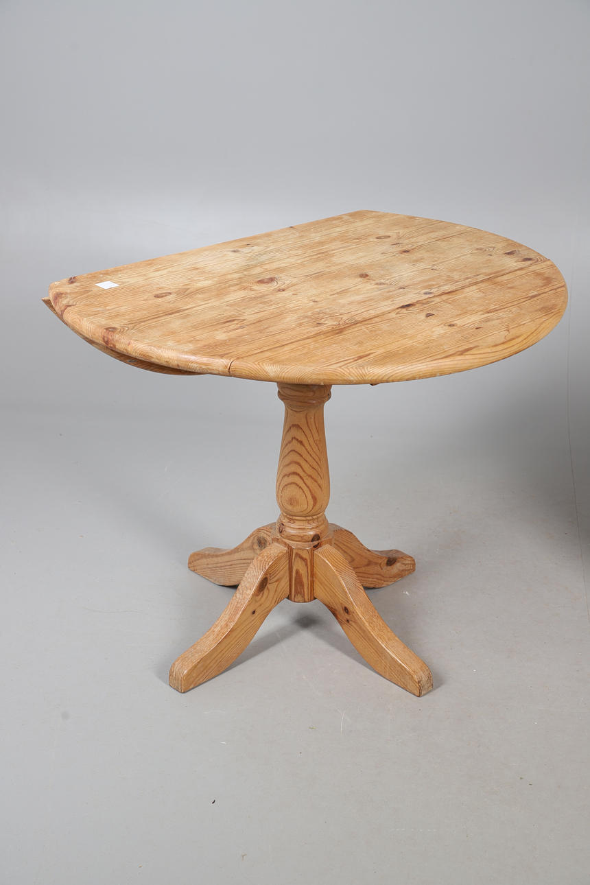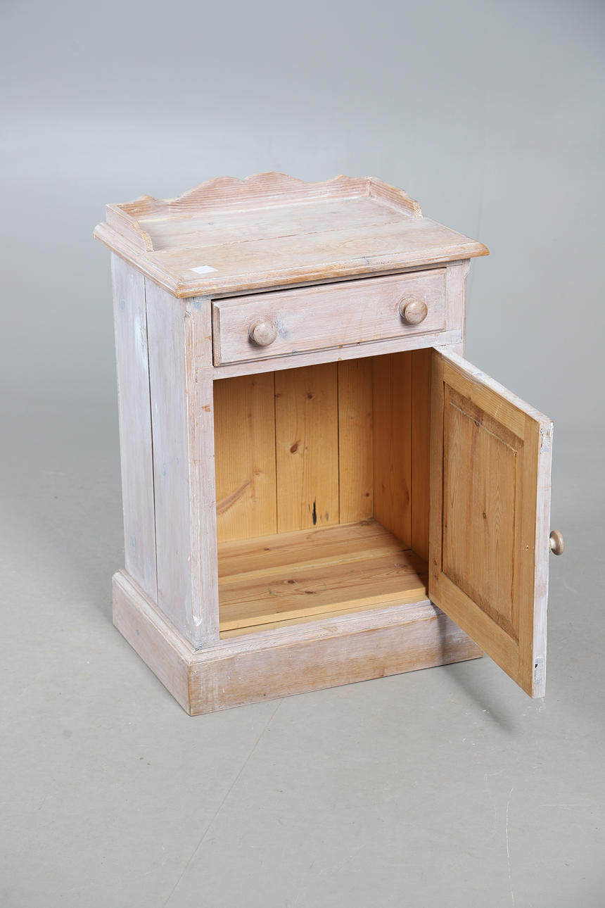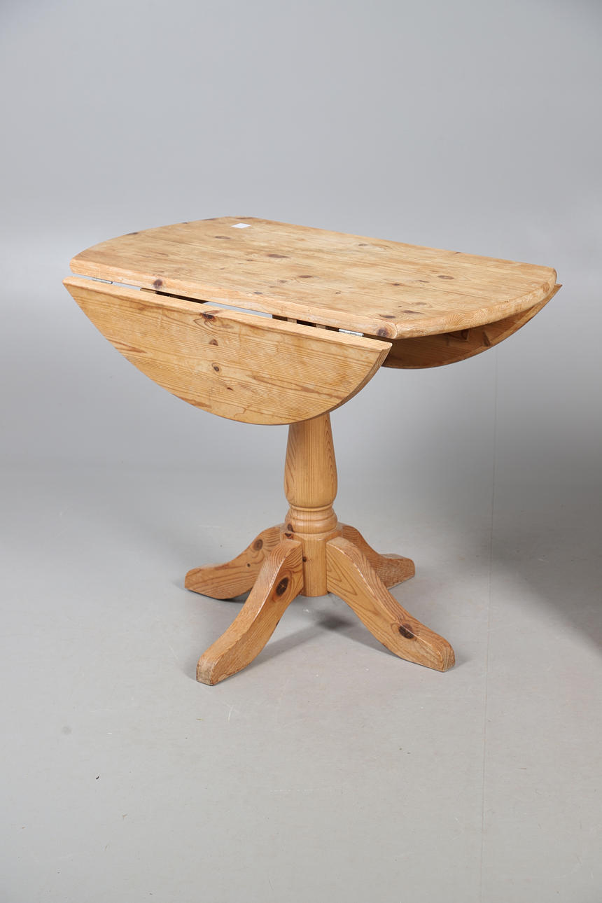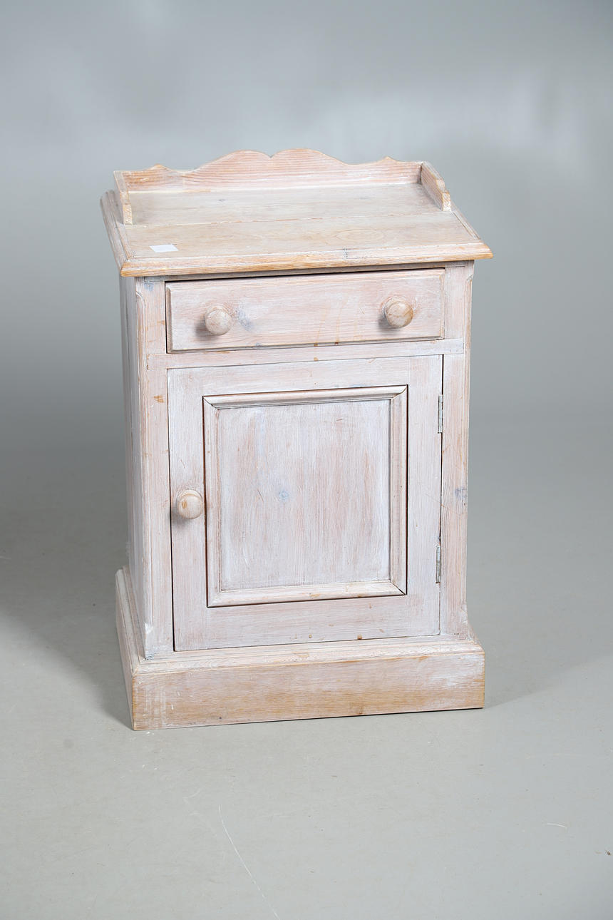Including a small circular pine drop flap table, and a painted bedside cupboard. Table 92cms long, extended 92cms diameter, 76cms high, cupboard 71cms high. (2).