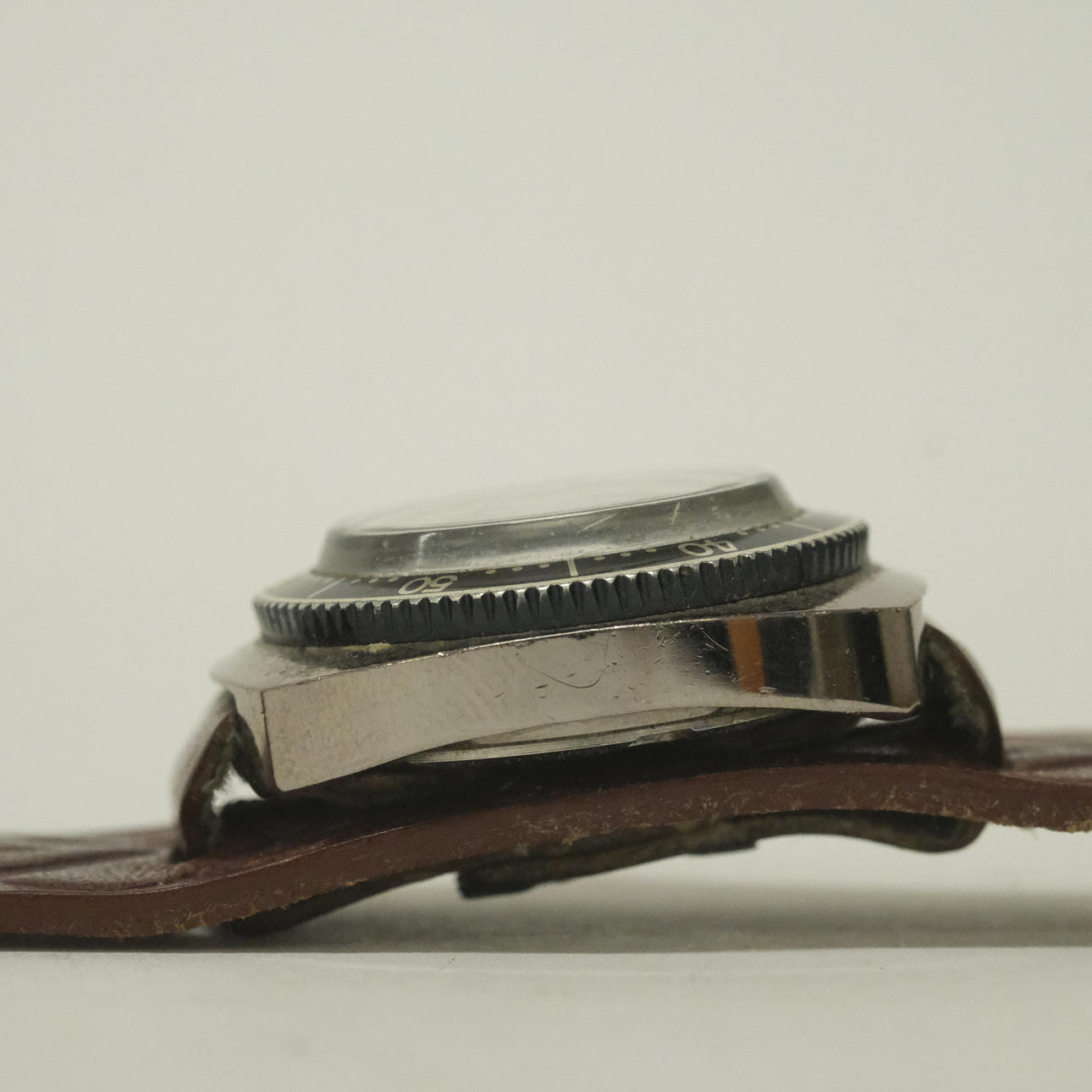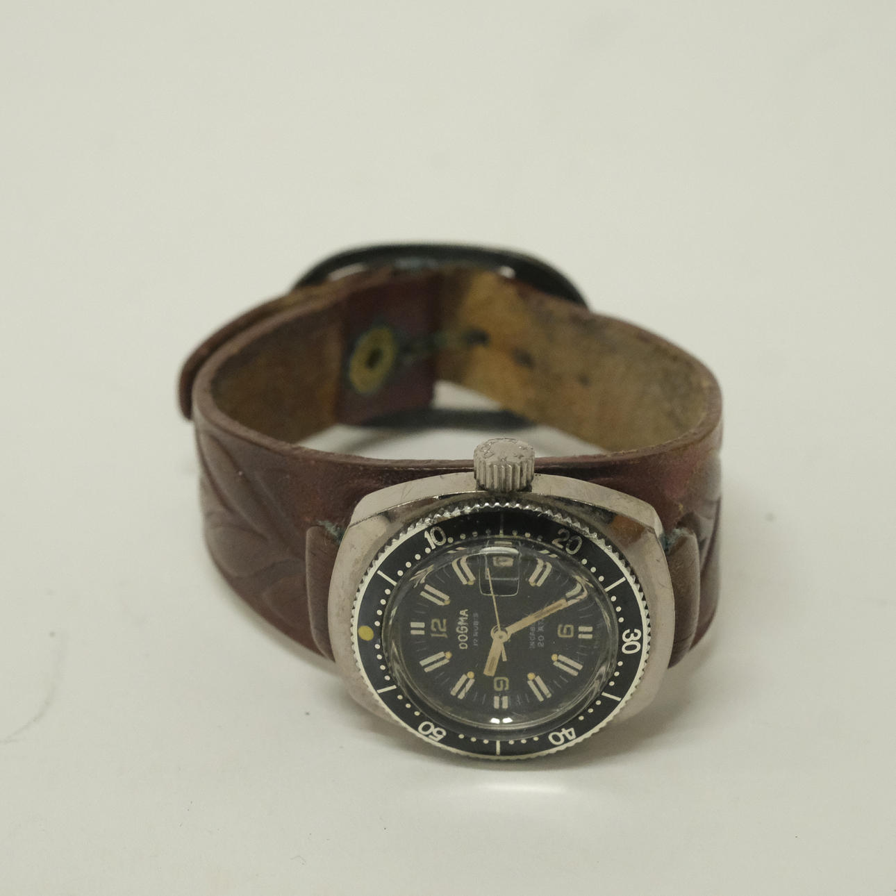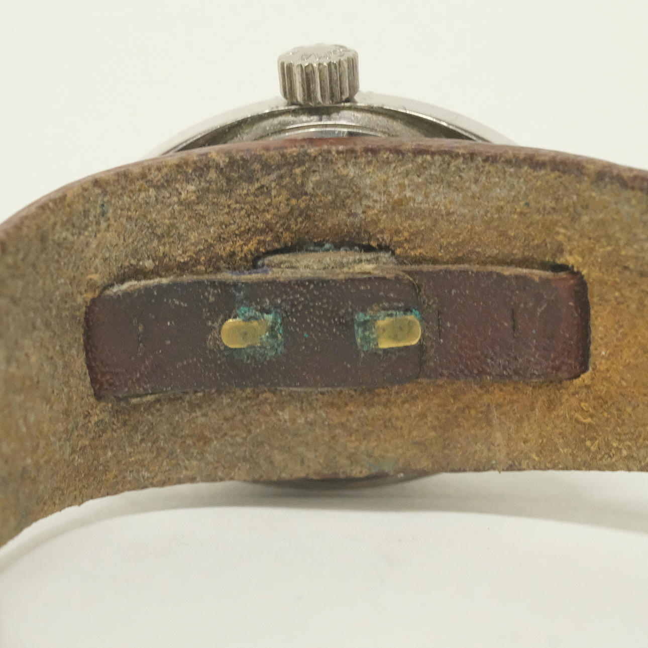 Use- and age-related wear. Crystal and case with scratches. Leather strap attachments with verdigris.