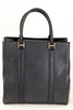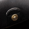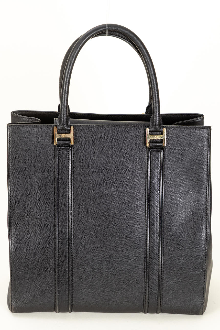 Saffiano leather. Snap button closure, three interior pockets, one of which has a zipper.