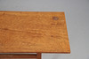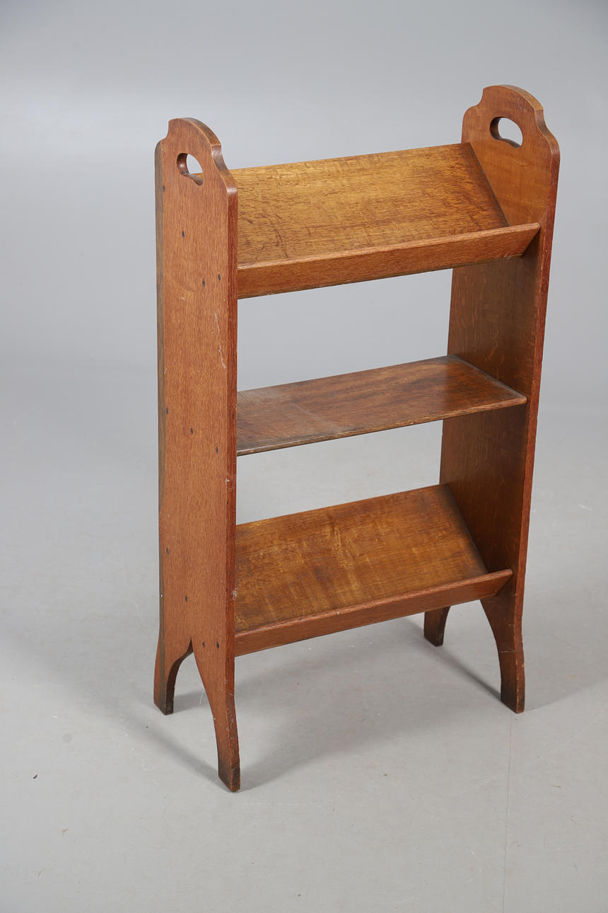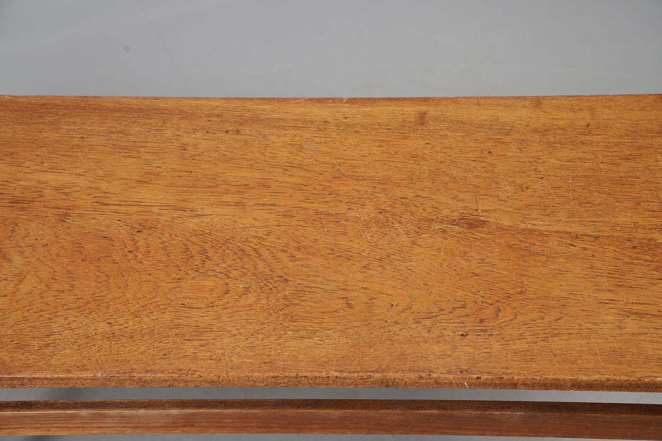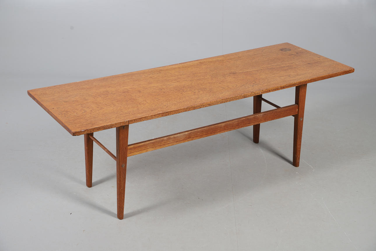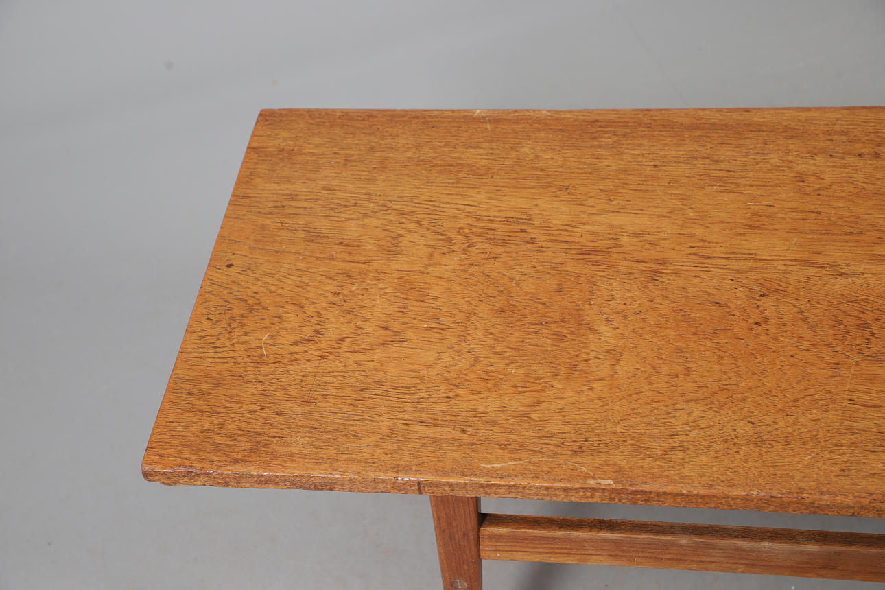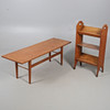 A mid century coffee table with a rectangular top and supported on tapering legs (top 131cms by 44cms, 46cms high), also with an oak shoe rack (91cms high). (2).
