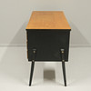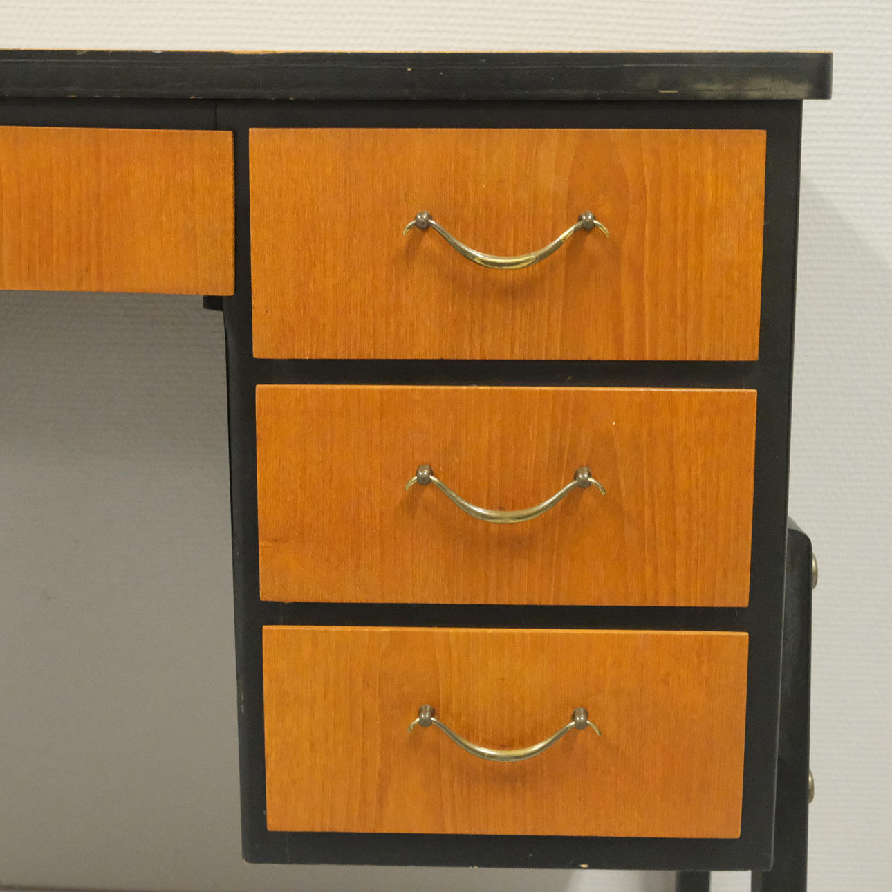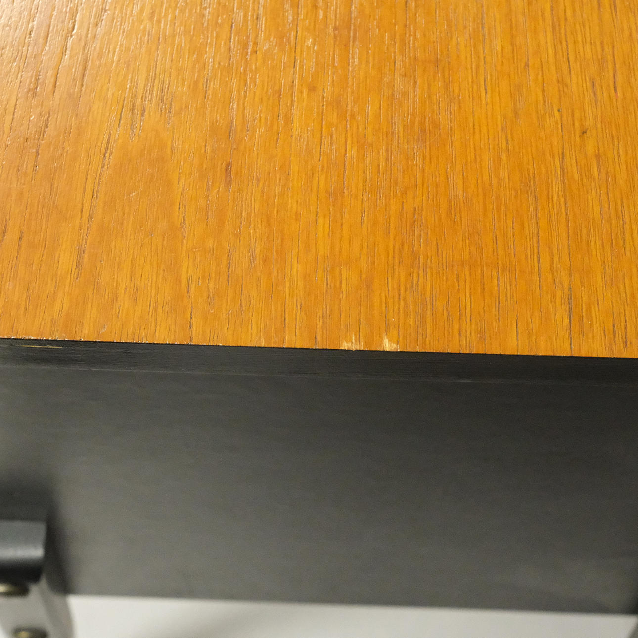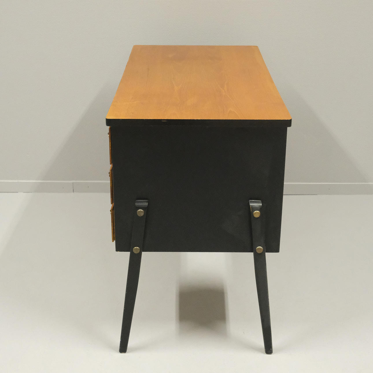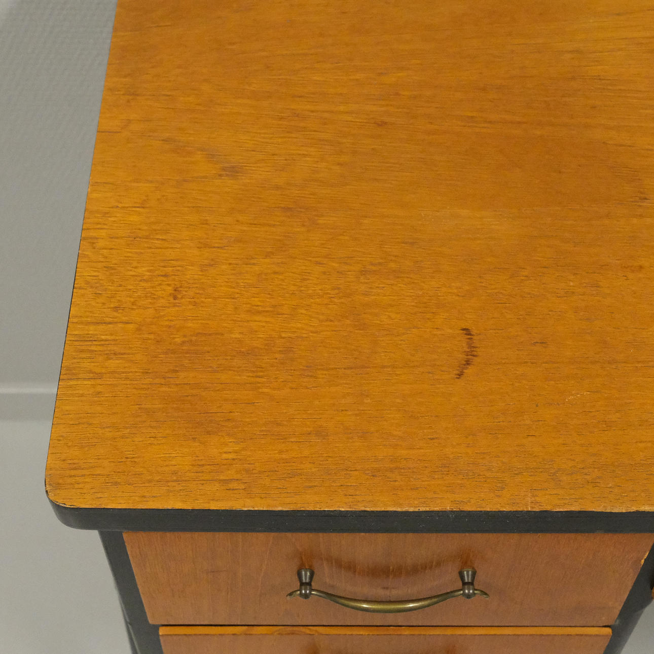 Four pull-out drawers, brass fittings, veneered teak, black frame. Height 73cm. Length 100cm. Width 50cm.