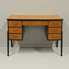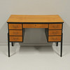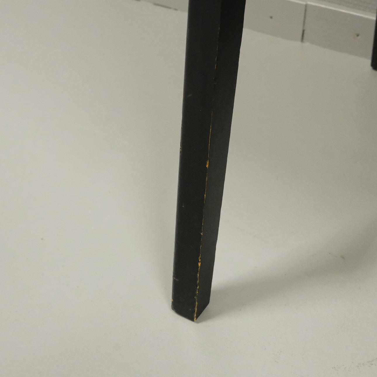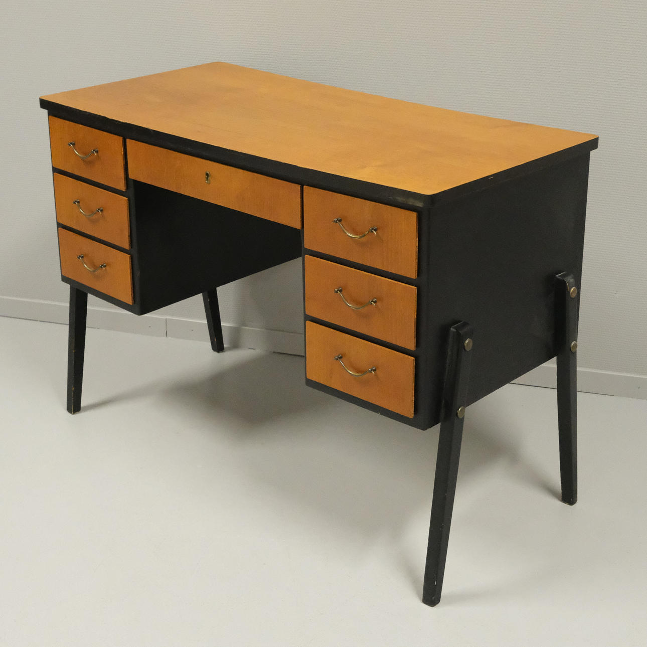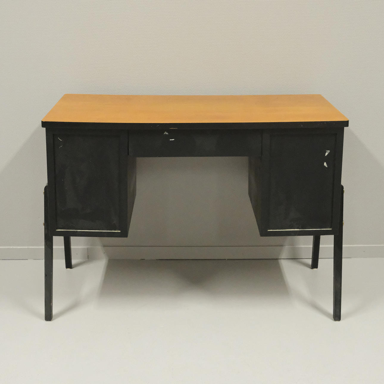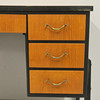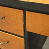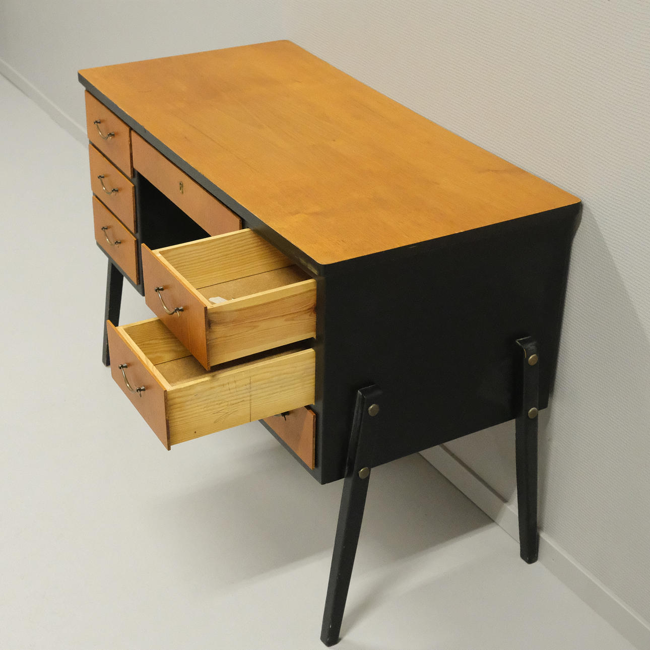 Four pull-out drawers, brass fittings, veneered teak, black frame. Height 73cm. Length 100cm. Width 50cm.
