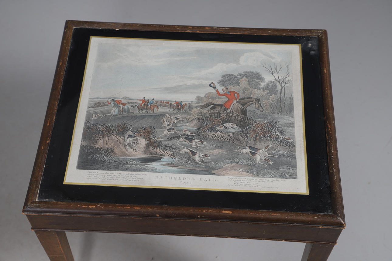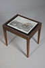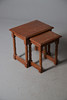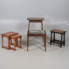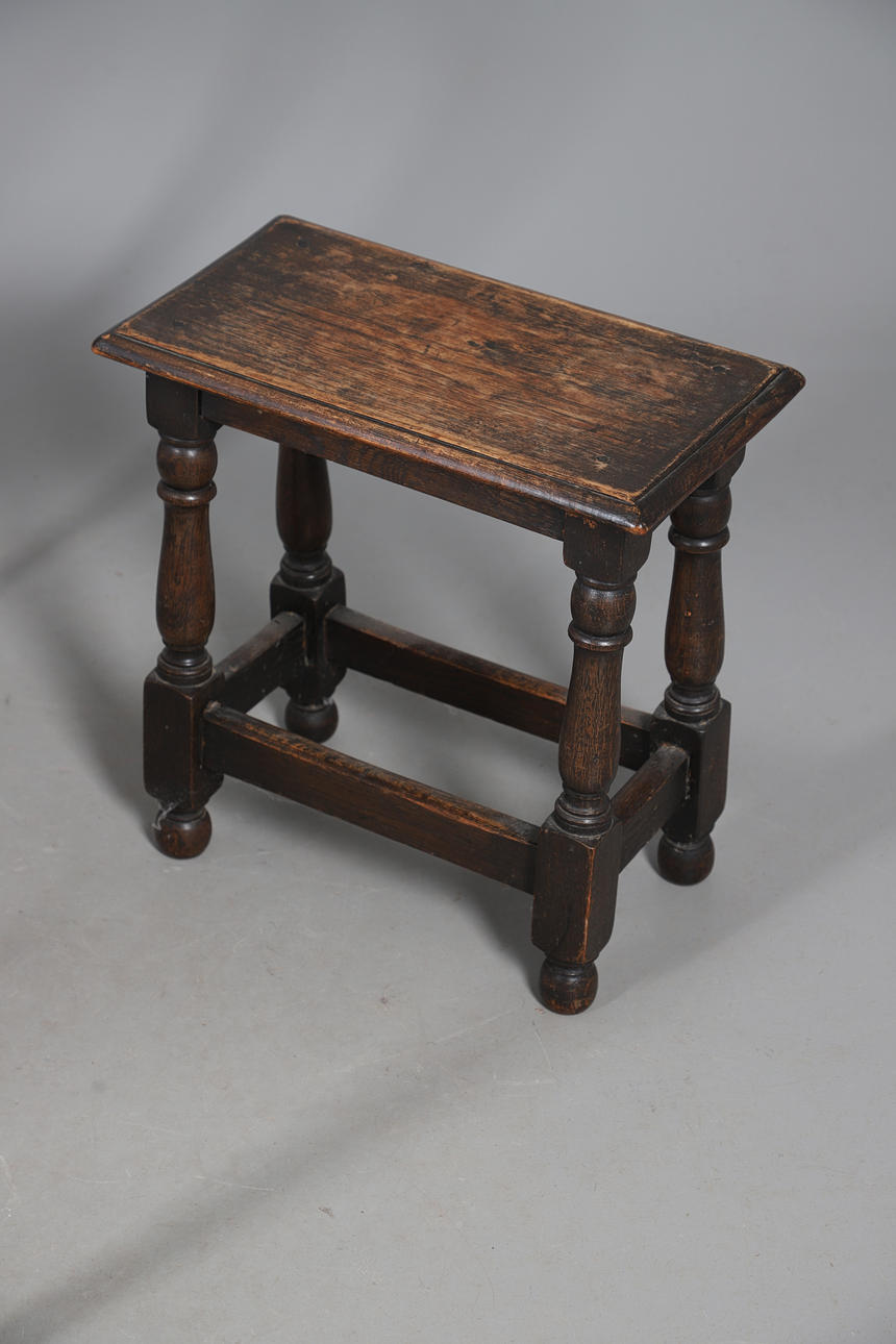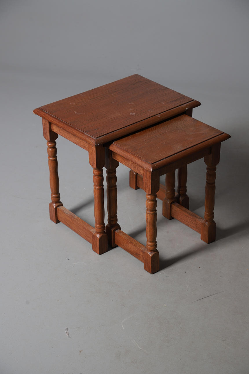 A quantity of tables, to include a to tier table with stringing, an oak joint stool raised on turned supports, a nest of two tables, and a low table. Size of largest, 70cm (h) x 53.5cm (w) x 38cm (d). (5).