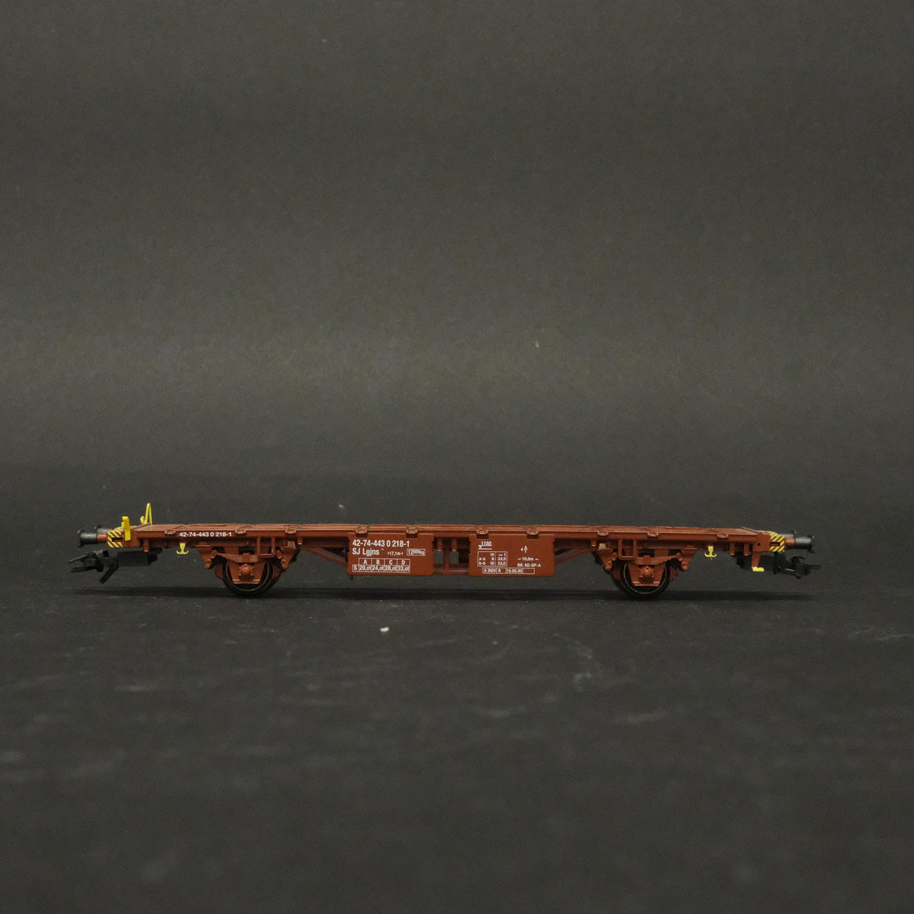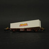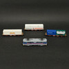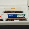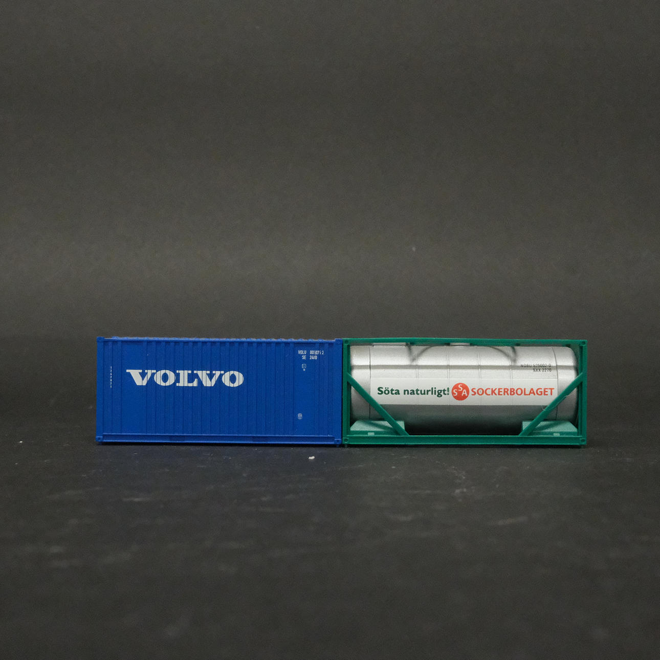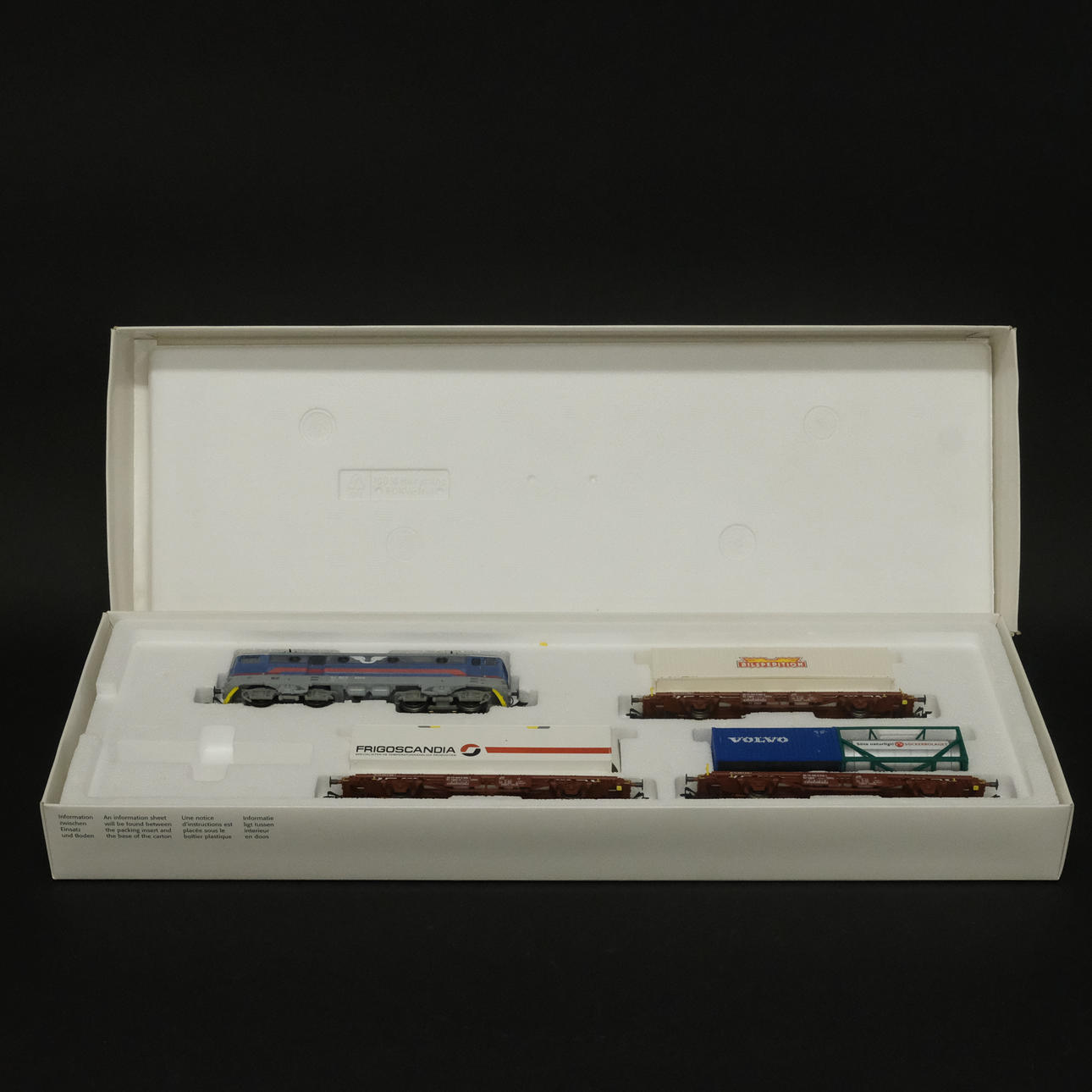 Three freight wagons with advertising including Volvo, Bilspedition, Frigoscandia, etc.