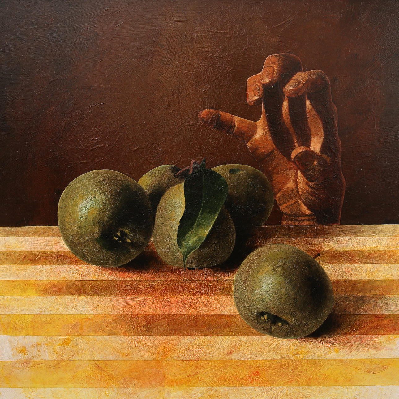 5017984. SVEN BERTIL BERG. Oil on panel, composition with hand and apples, signed.