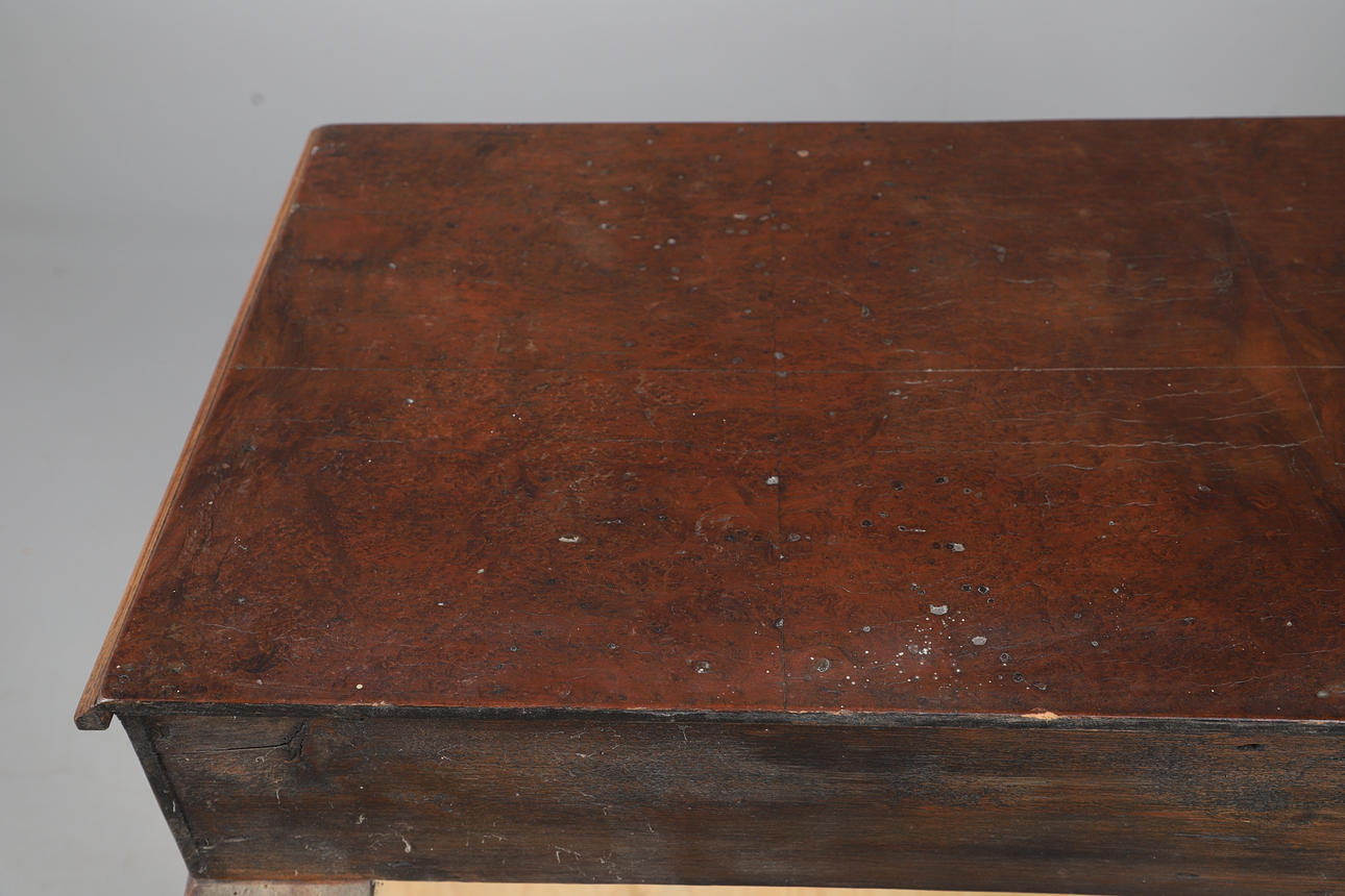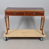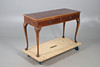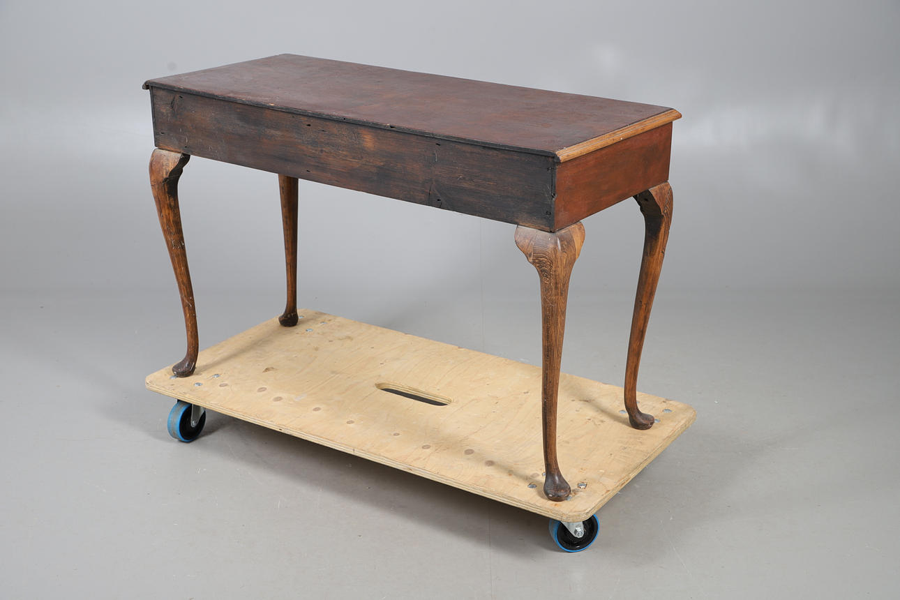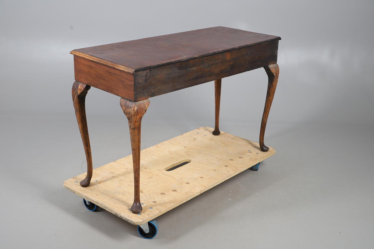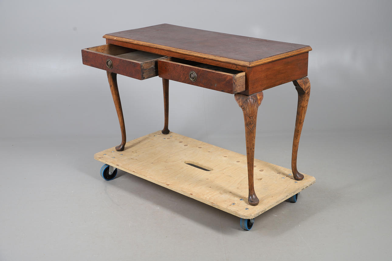 With walnut veneered top and two short drawers raised on scalloped cabriole supports, W110 x H72 x D46cm.