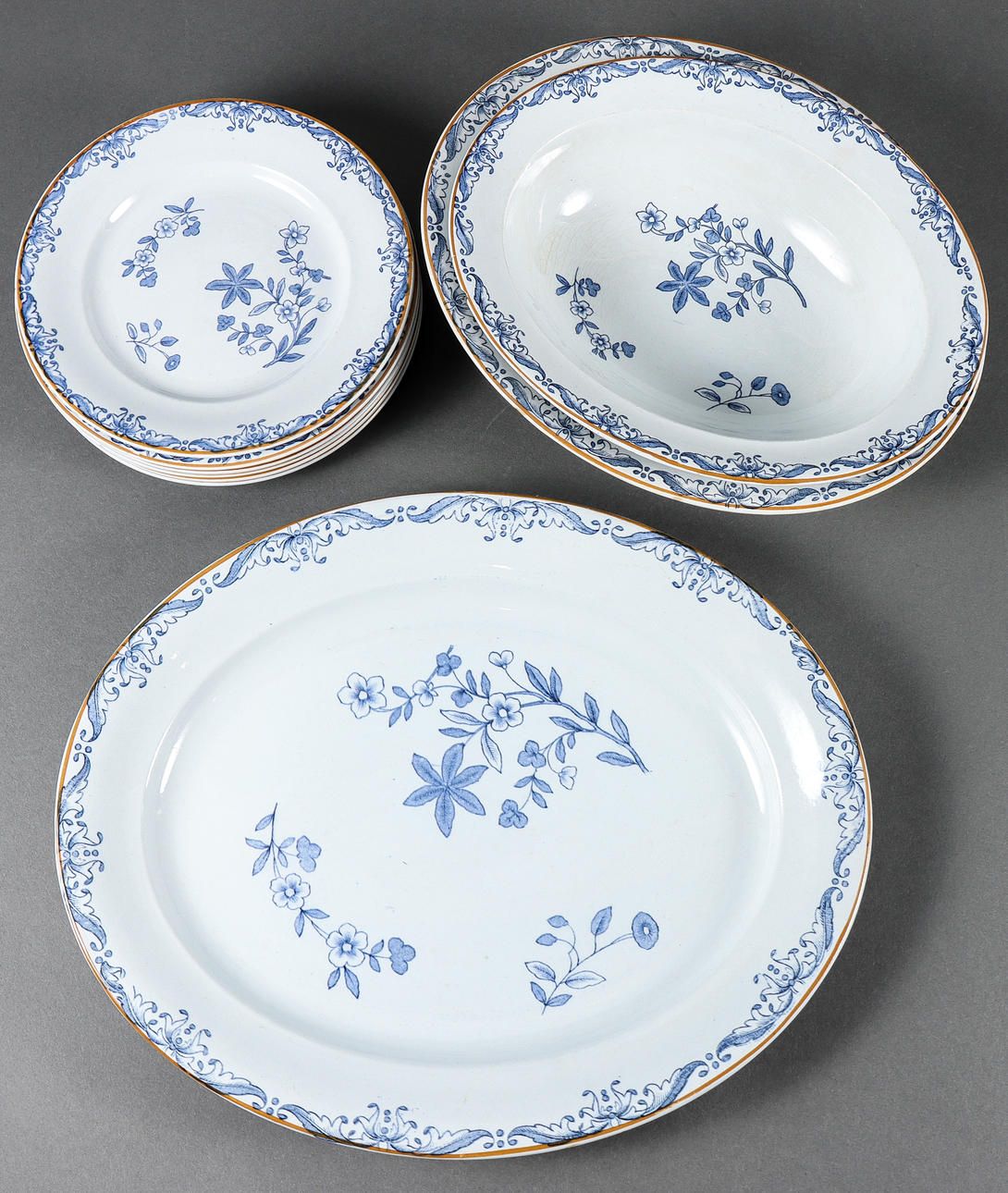 Damage to one bowl. Some pieces with discoloration including the jug.
