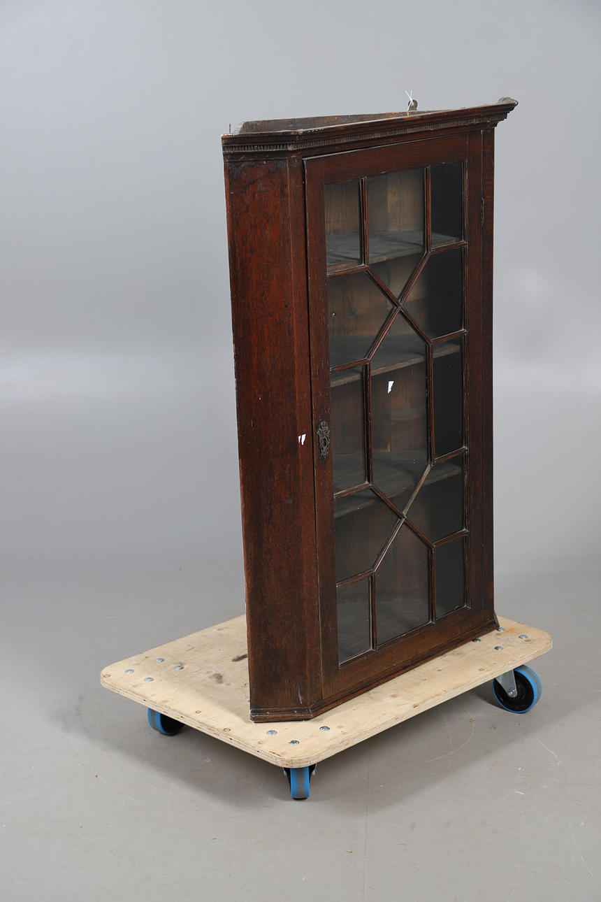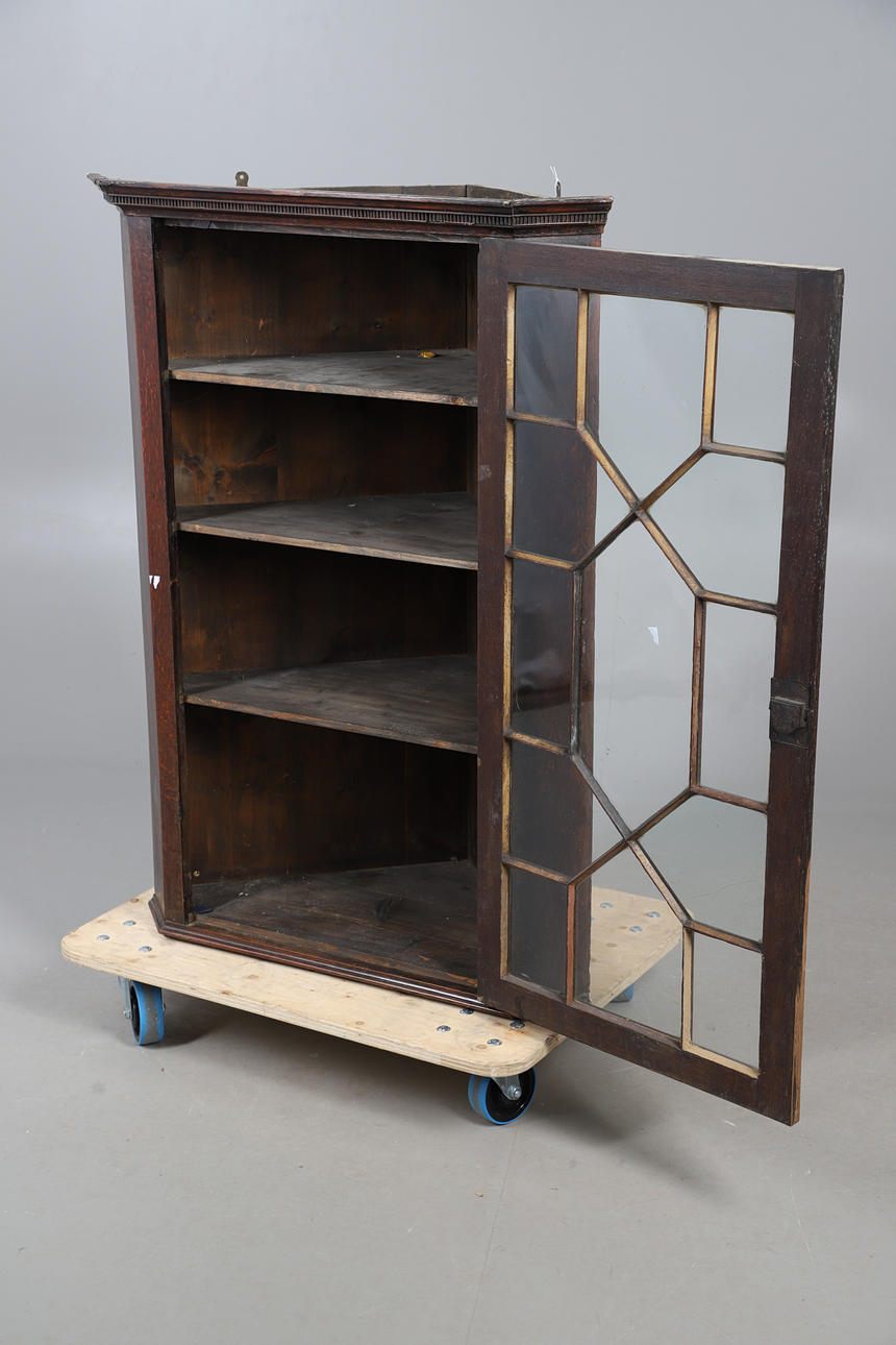 OAK GLAZED CORNER CUPBOARD.