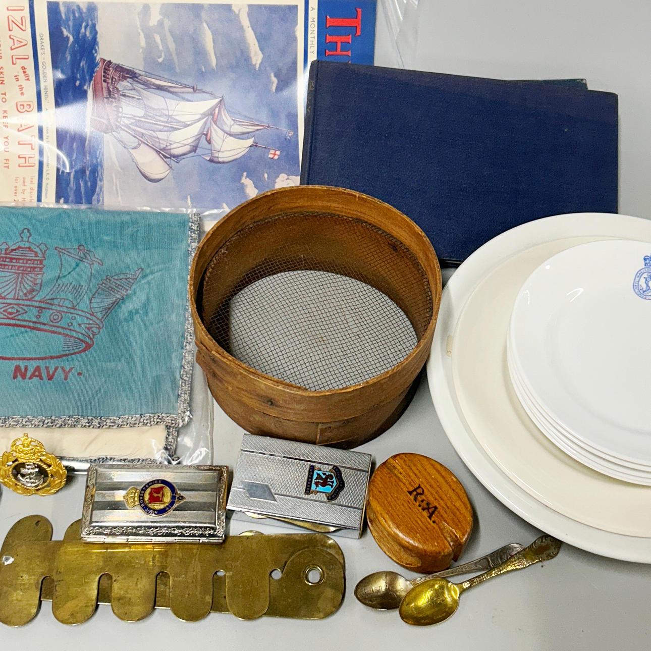 A quantity of mixed general Royal Navy items, including badges, books, and other related items, approximate volume 29 x 29 x 26cm.