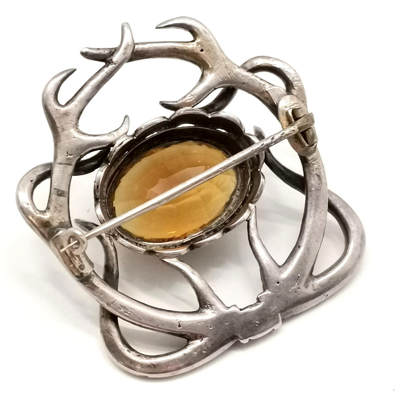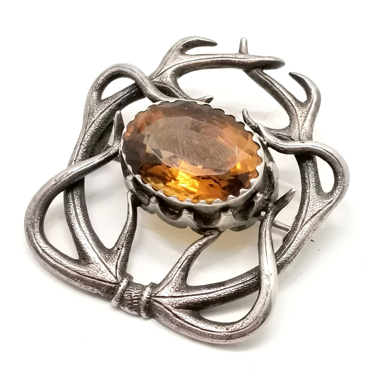 Unmarked silver Scottish brooch with citrine surrounded by 12 pointer antlers - 5cm across & 34g total weight.