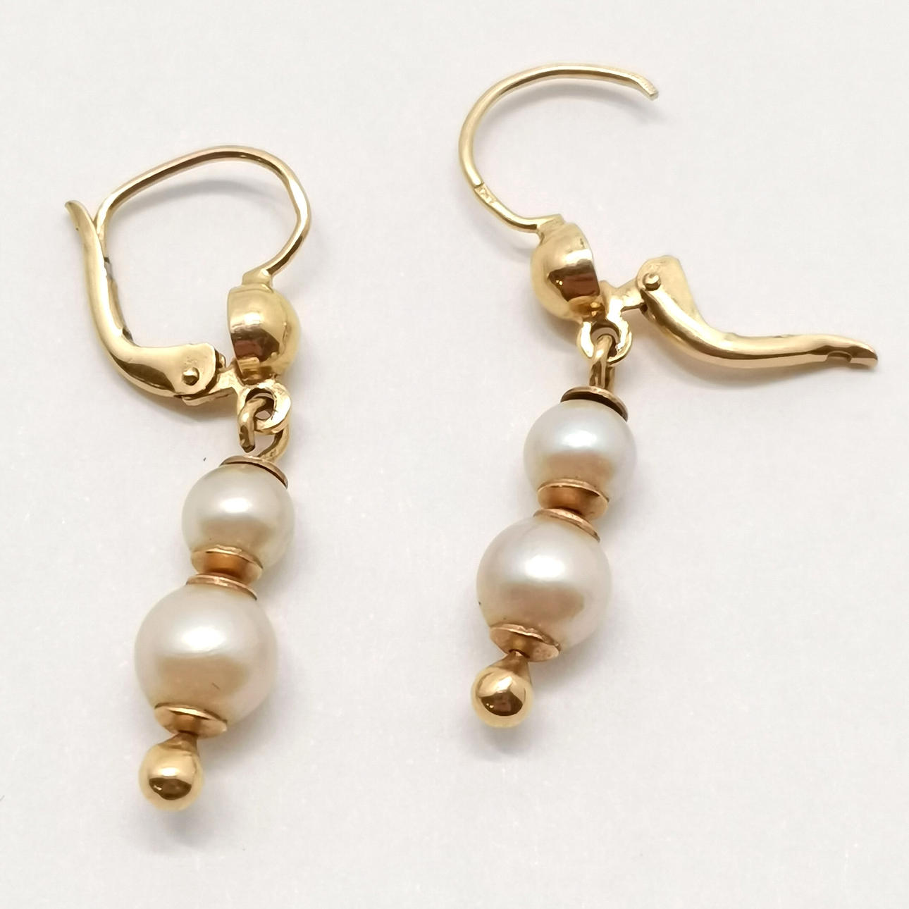 Continental 18ct marked gold pair of double pearl drop earrings - 3.2cm drop & 3.8g total weight.