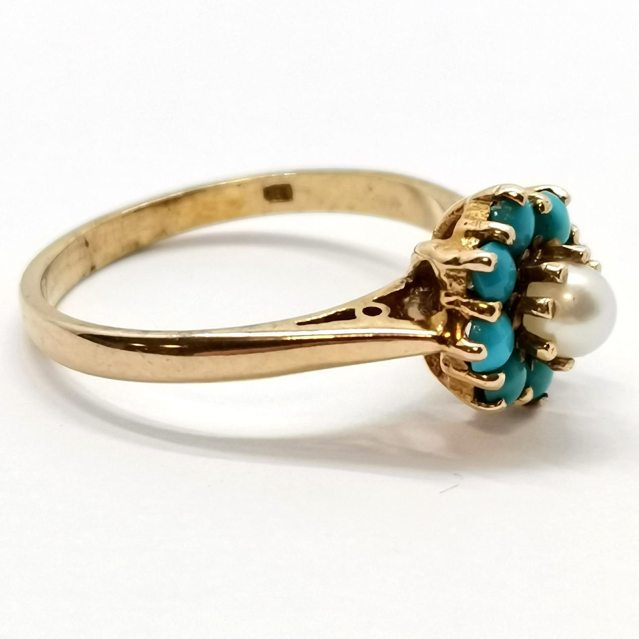 9ct hallmarked gold turquoise & pearl cluster ring - size O & 2.7g total weight.