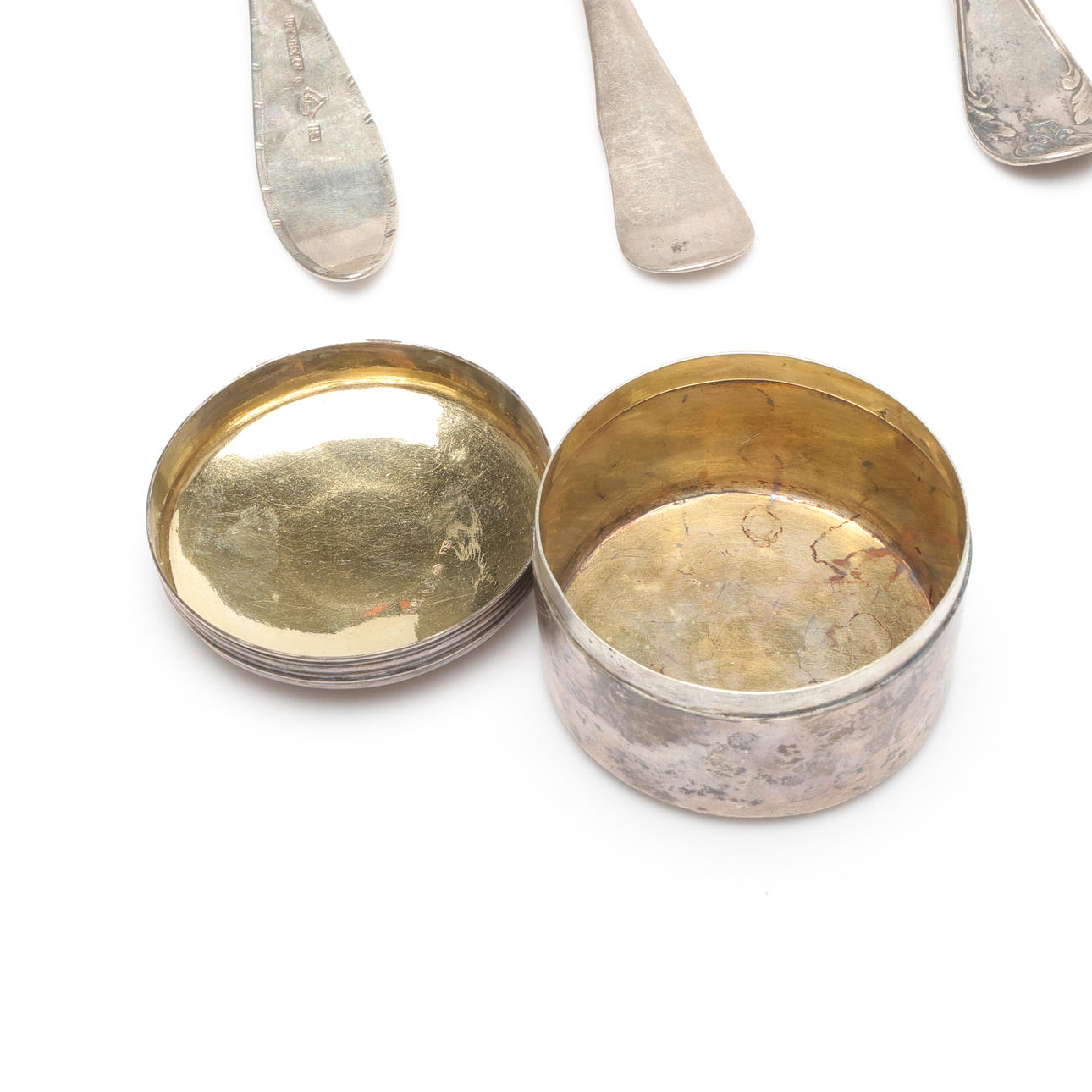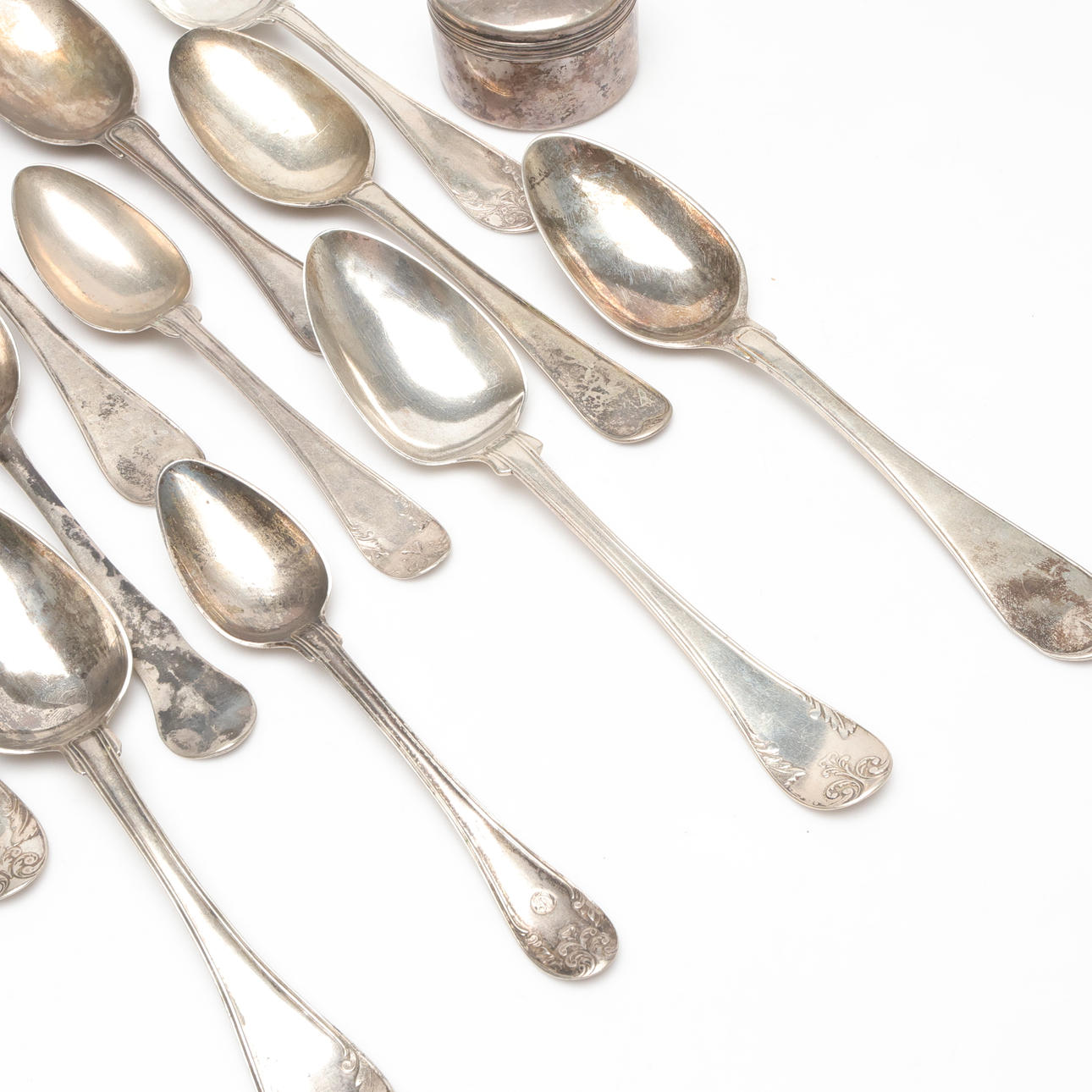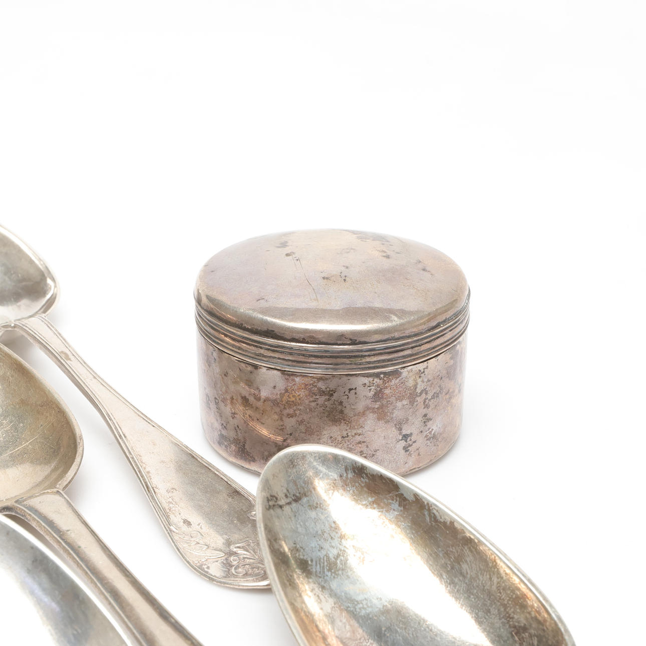 BOX AND SPOONS, Silver, weight approx. 974 grams.
