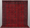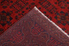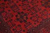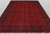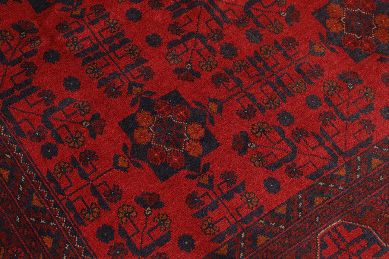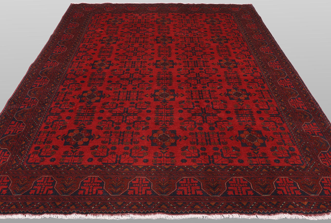 Afghan fine with a red base color and a center field covered in repeating dark blue lake motifs. The border consists of repeating geometric patterns in similar colors. The bangs are made of wool and the warp is made of cotton.