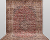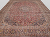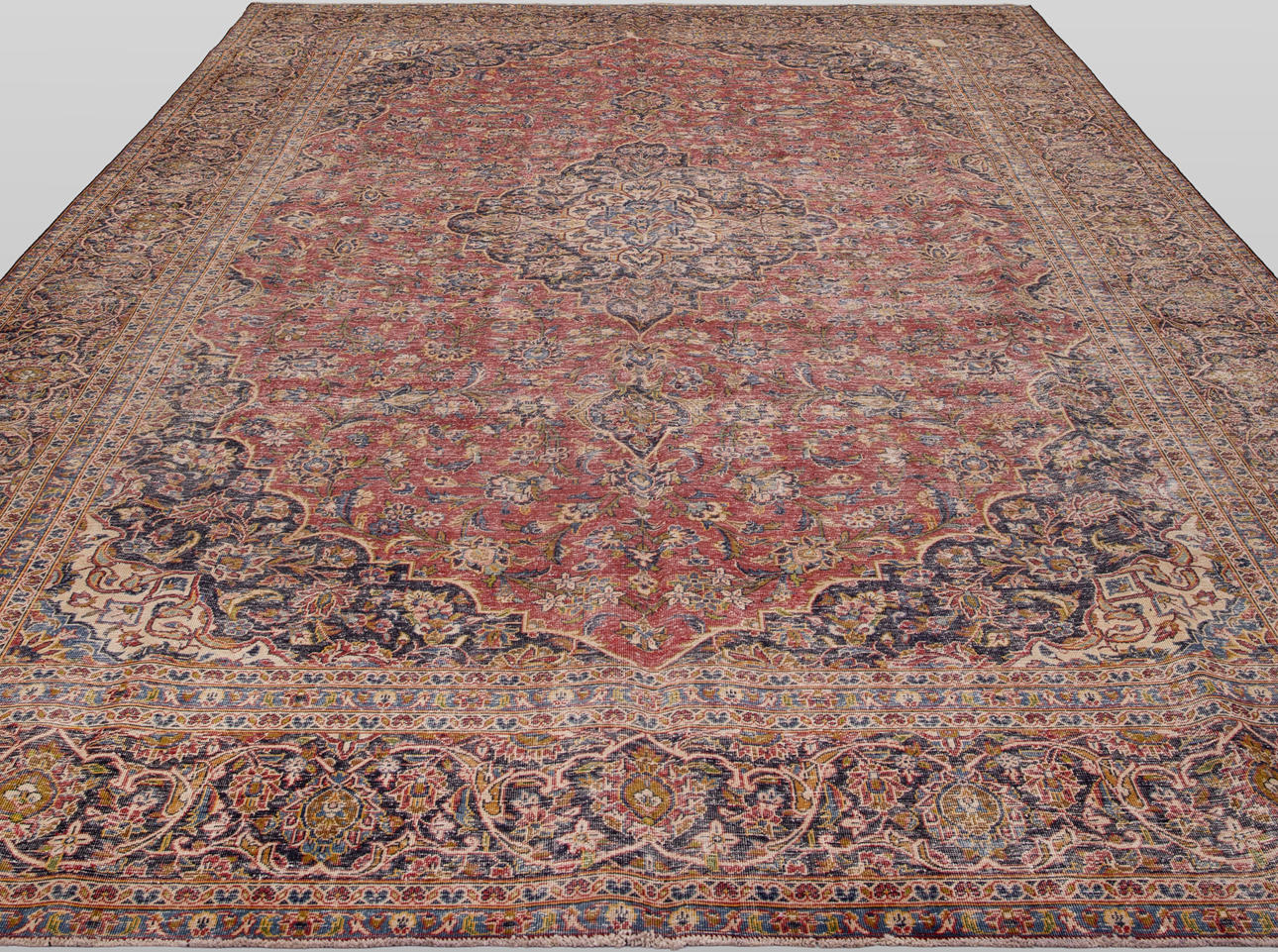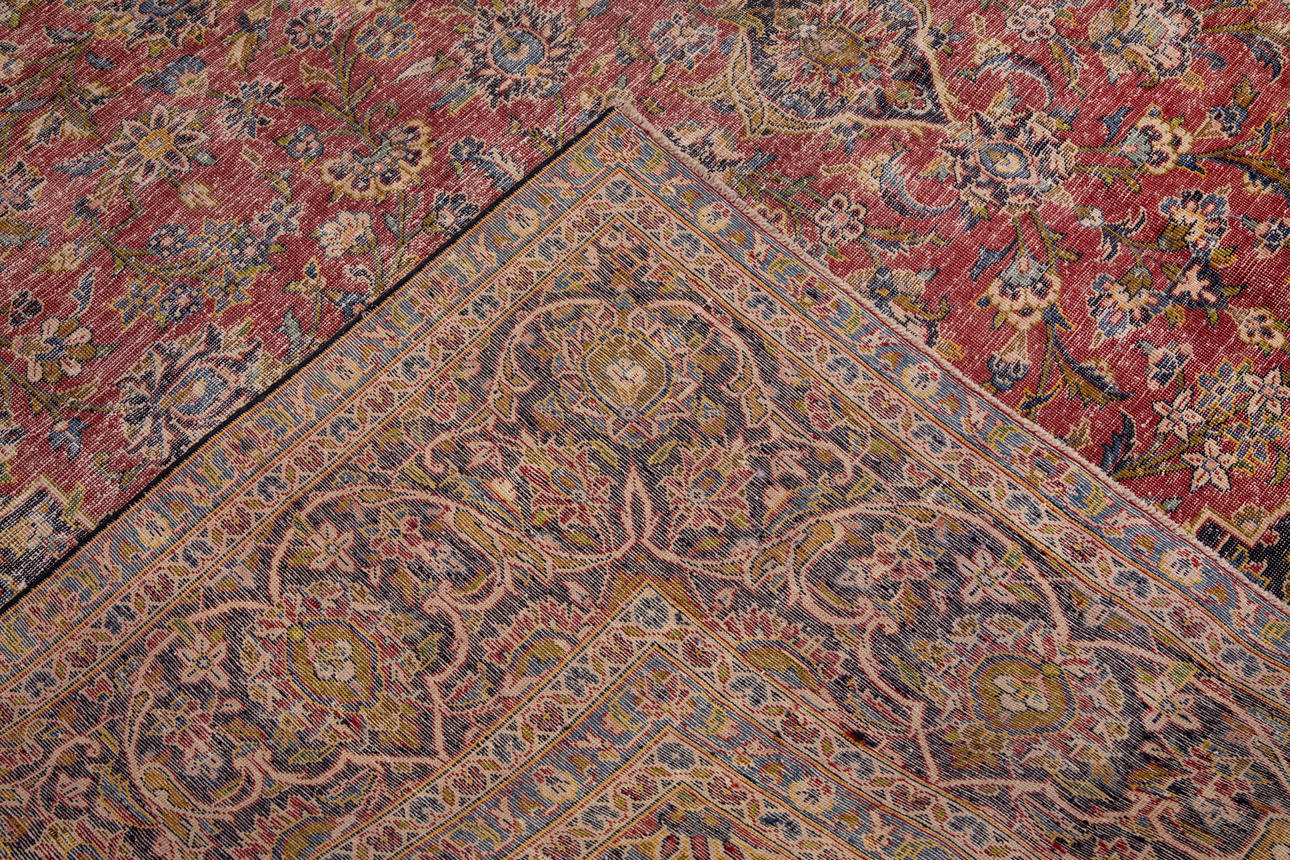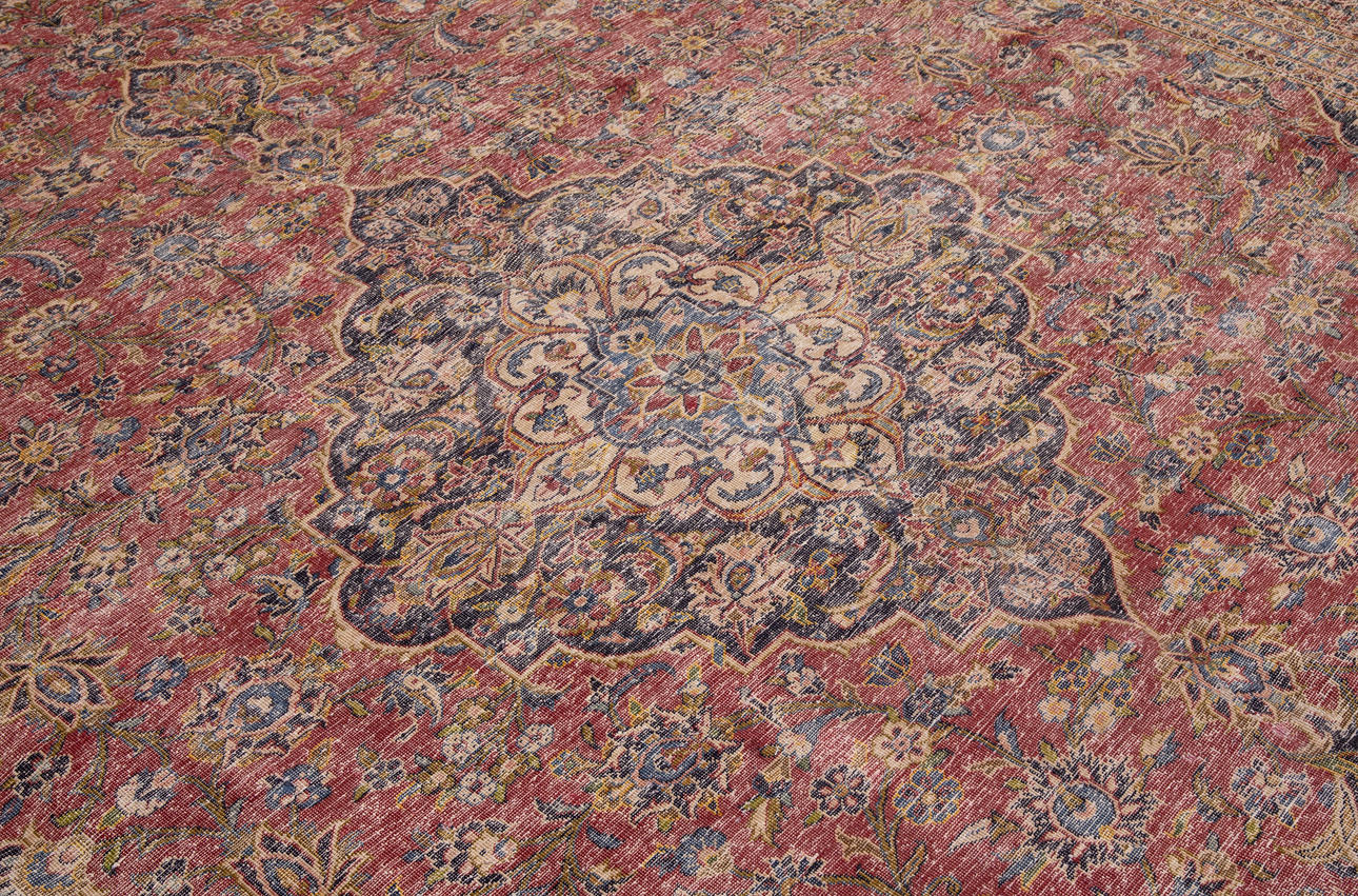 Vintage with red base color and a centrally placed medallion in dark blue and beige. The center field is decorated with floral ornaments, palmettes and arabesques, and the corner portions follow the design language of the medallion. The border has a dark bottom with decoration of palm branches. The forelock is made of wool and the warp is of cotton.