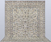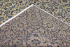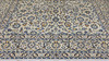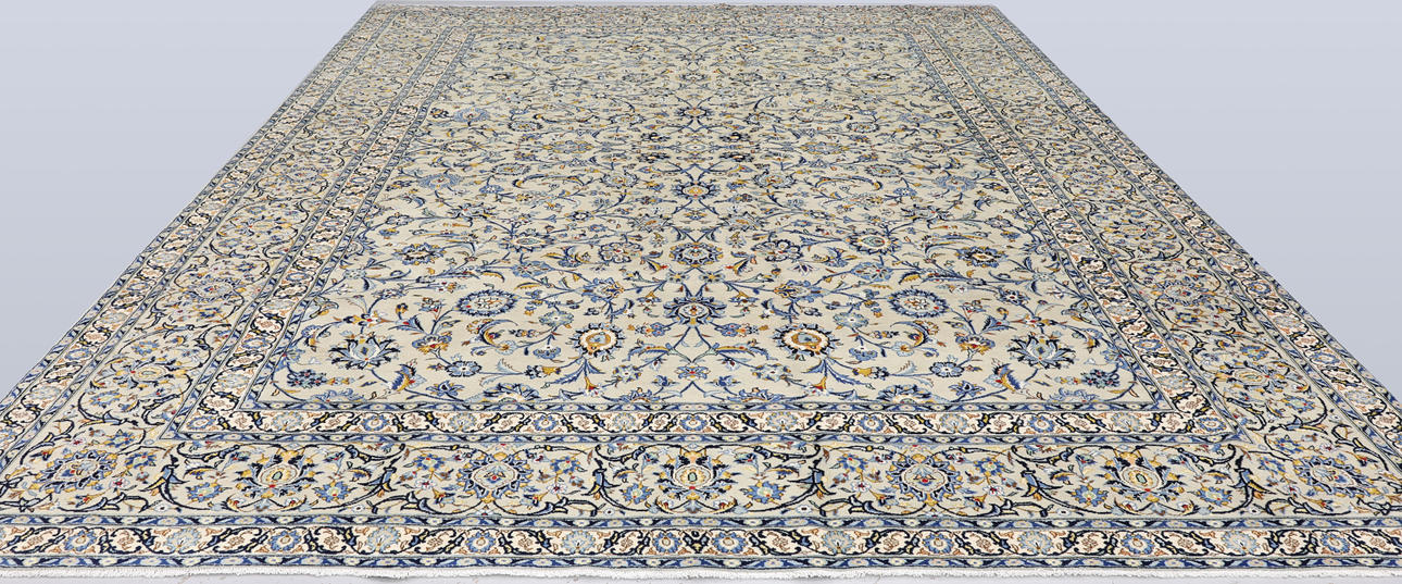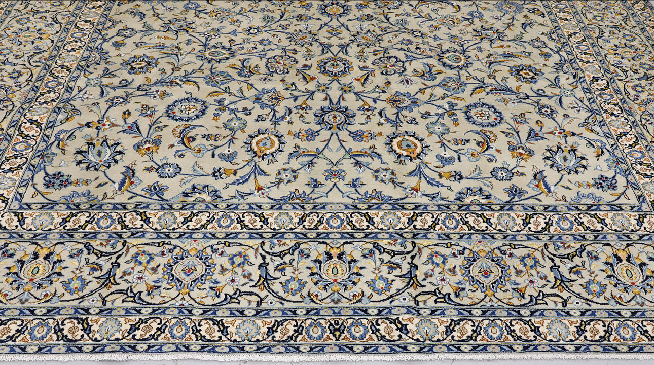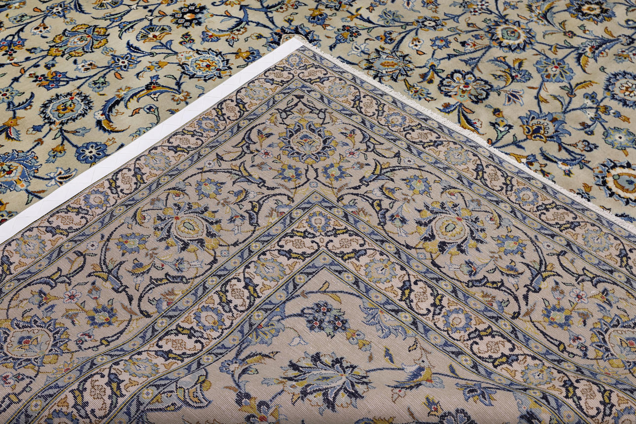 Keshan fine with bright bottom color and a center field covered with floral ornaments, palmettes and arabesques in blue, beige and yellow details. The border has a bright bottom and decor of palm branches. The forelock is made of wool and the warp is of cotton.
