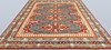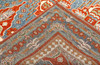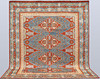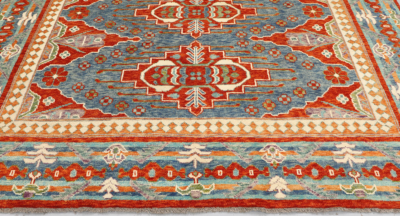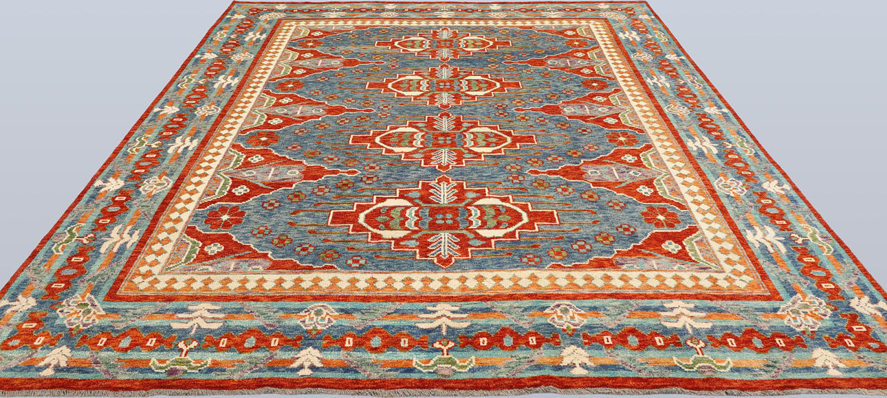 Azeri with blue base colour and four centrally placed medallion motifs in red, beige and light blue. The center field is decorated with geometric motifs and stylized flowers of similar shades. The border has a blue base with geometric decoration. The forelock is made of wool and the warp is of cotton.