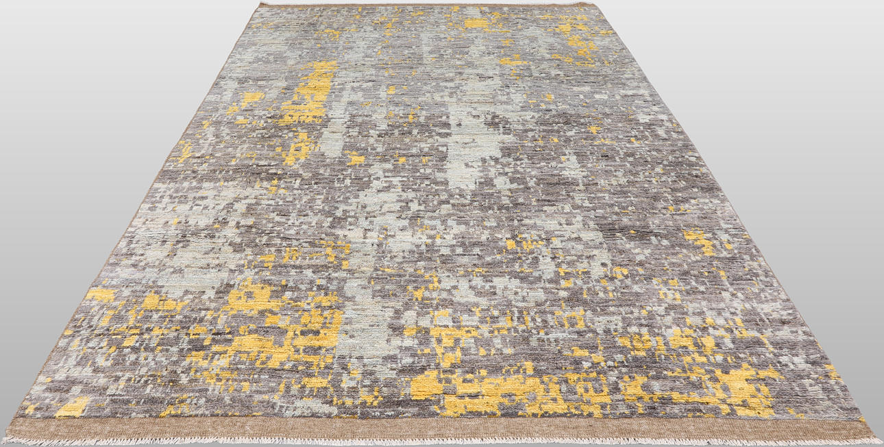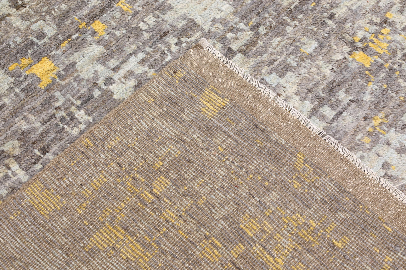 Morocco design with an abstract composition in gray and yellow tones. The forelock is made of wool and the warp is of cotton.