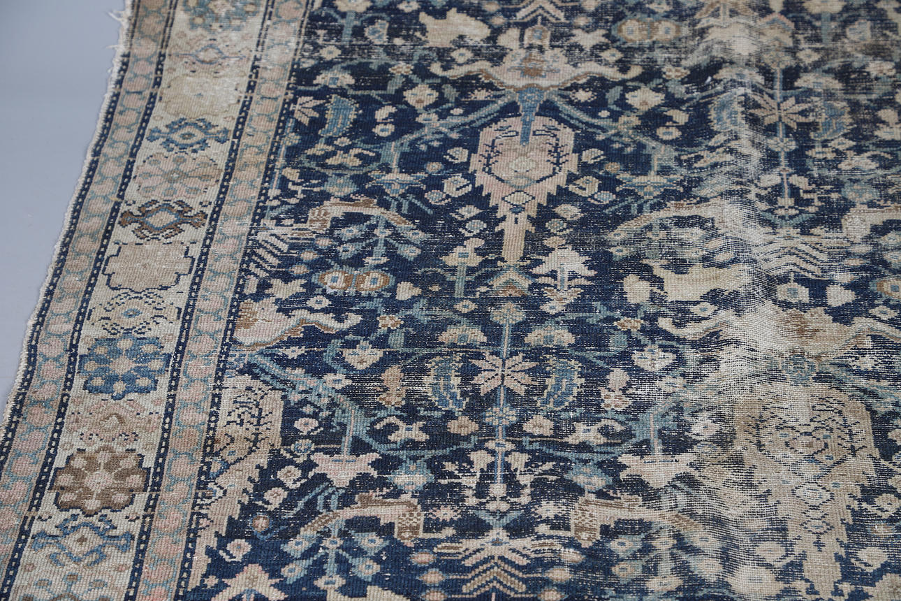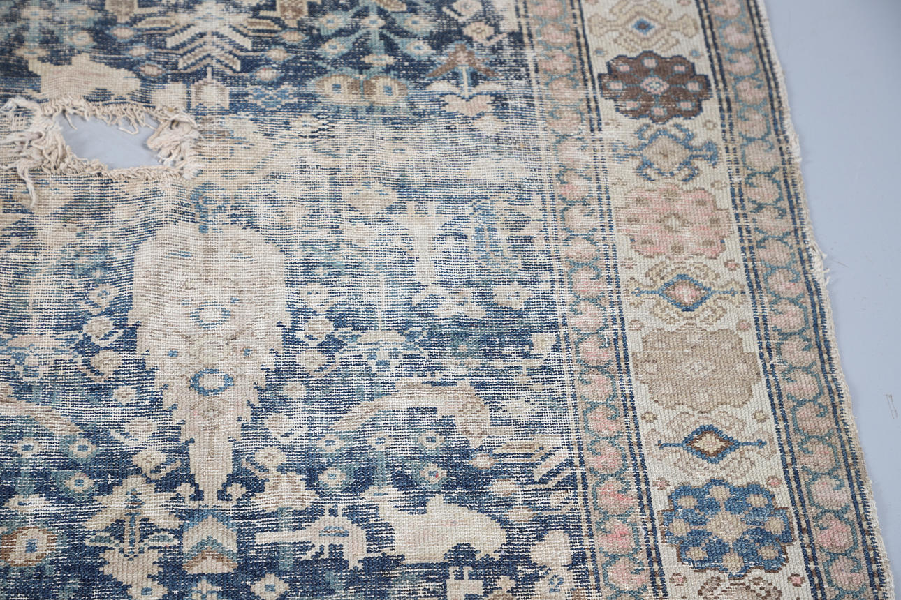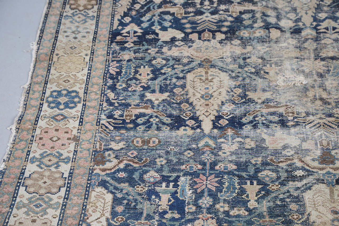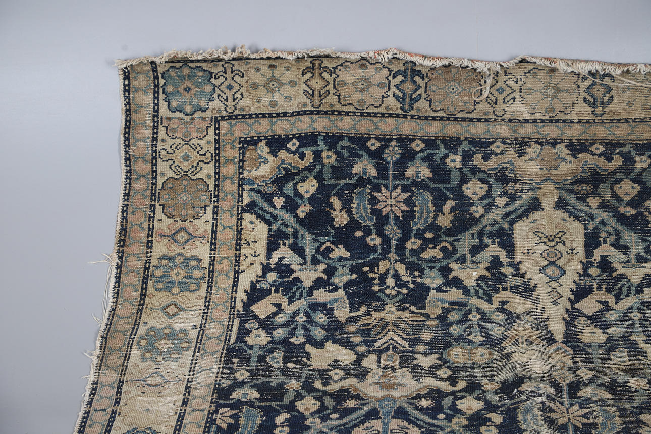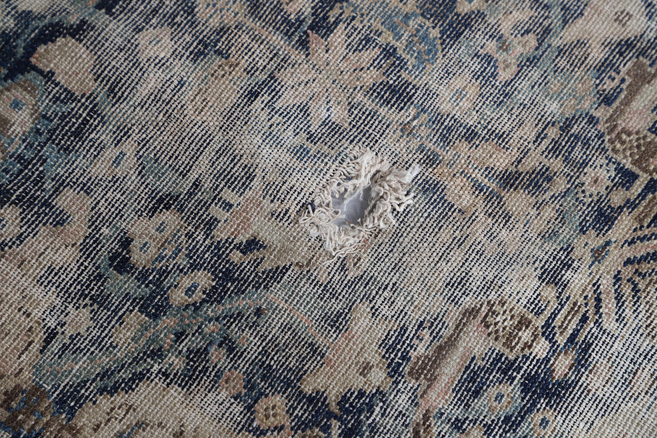 Extensively threadworn, large holes, wear to edges, fringes worn.