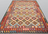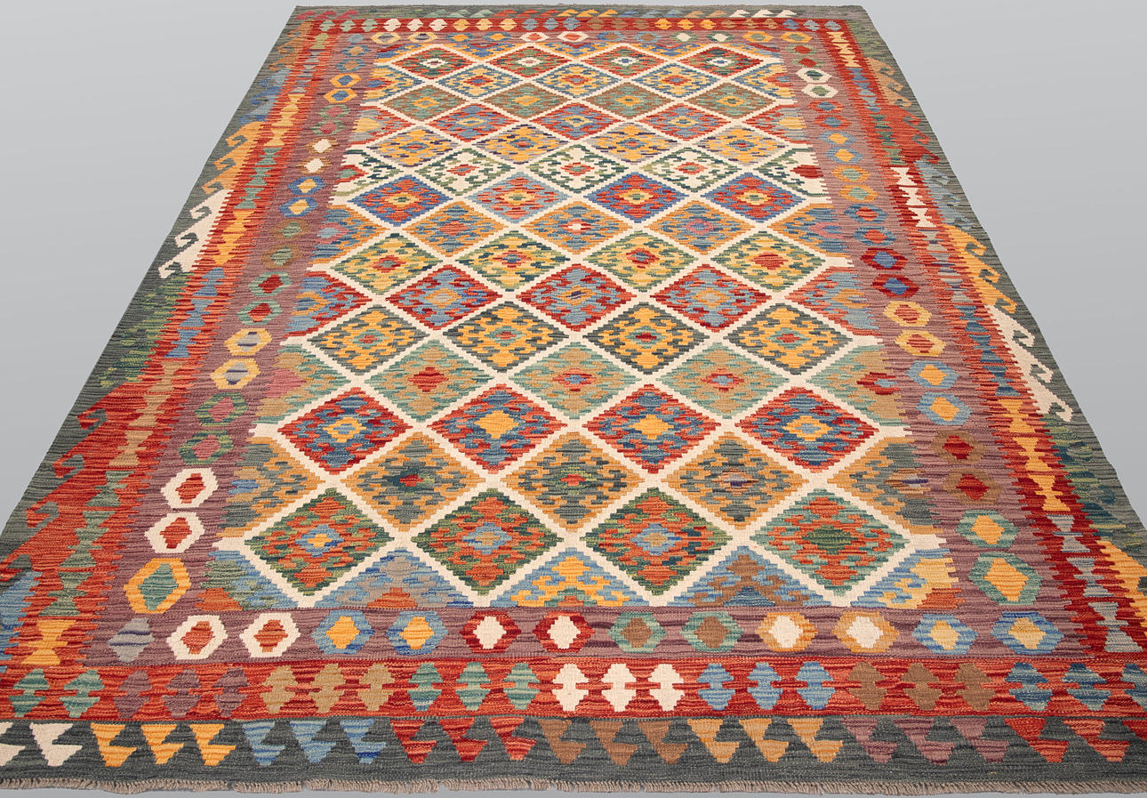 Hand-woven Kelim in classic design with geometric pattern in polychrome color scale.